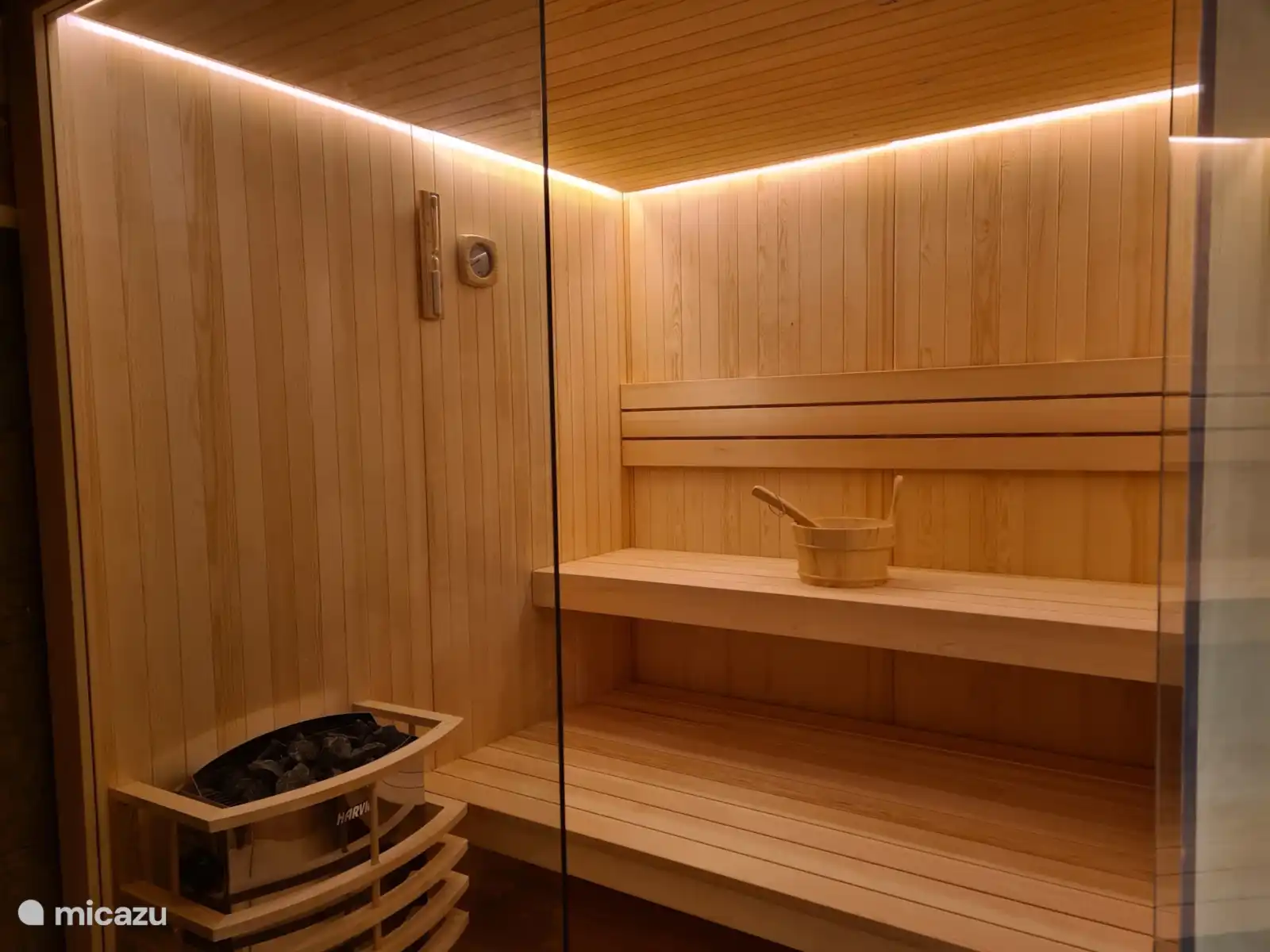 La deuxième salle de bain propose un sauna finlandais, une baignoire, une douche de pluie, un lavabo et une seconde toilette.