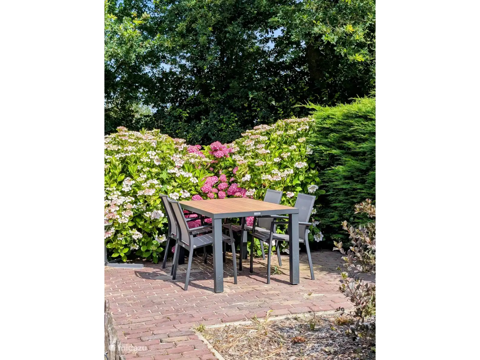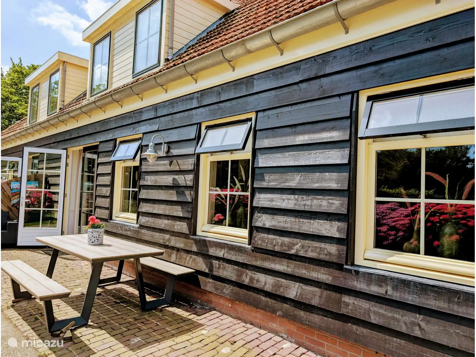 La cuisine dispose d’une grande table à manger pour 8 personnes, d’un réfrigérateur, d’un congélateur, d’une plaque à induction, d’un micro-ondes combi et d’un lave-vaisselle. Les portes du patio mènent à une terrasse avec table de pique-et terrasse privée au niveau de l’aire de jeux, équipée de meubles de jardin et de parasol.