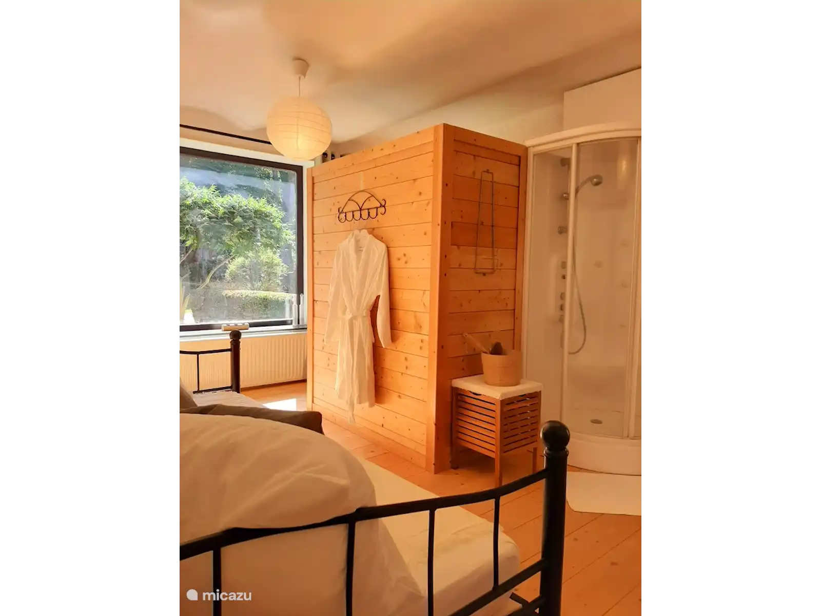 Le Gîte est entièrement équipé tel qu’un sauna finlandais, une salle de détente, un jardin privé romantique, un salon extérieur, une cuisine, un poêle et un coin salon confortable avec bibliothèque.
