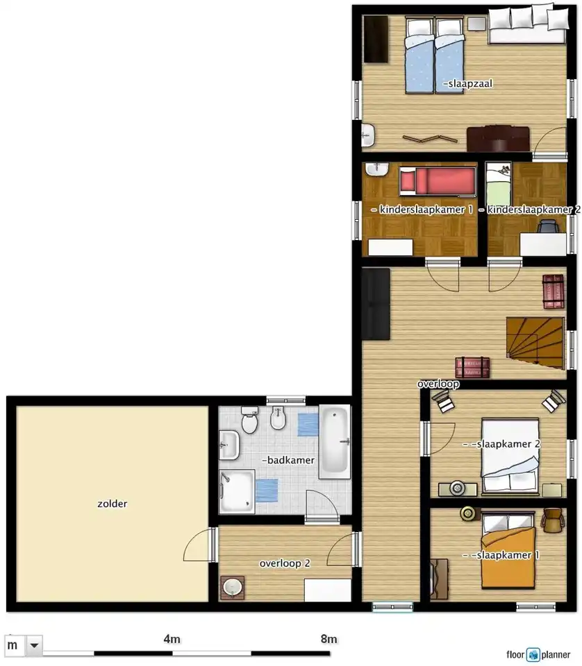 La maison comprend deux chambres doubles, une pièce avec un lit superposé, une chambre simple et une grande chambre avec un lit double fixe et possiblement deux lits simples supplémentaires.