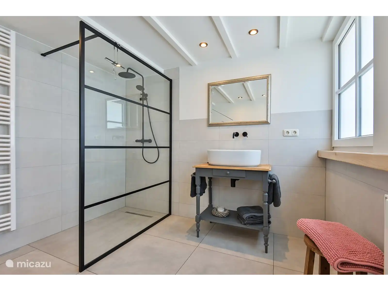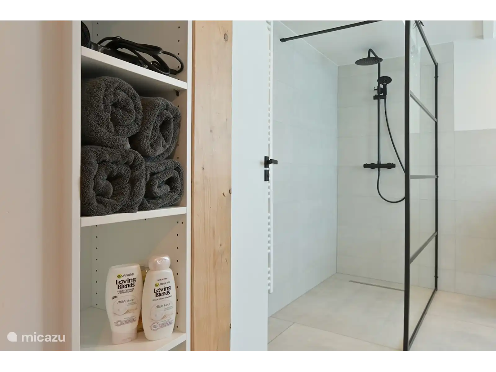 Au premier étage se trouve la chambre spacieuse avec une vue imprenable et un sommier tapissier luxueux pour 2 personnes. Il y a aussi une salle de bain privée séparée au 1er étage avec lavabo, douche à l’italienne à effet pluie et toilettes.