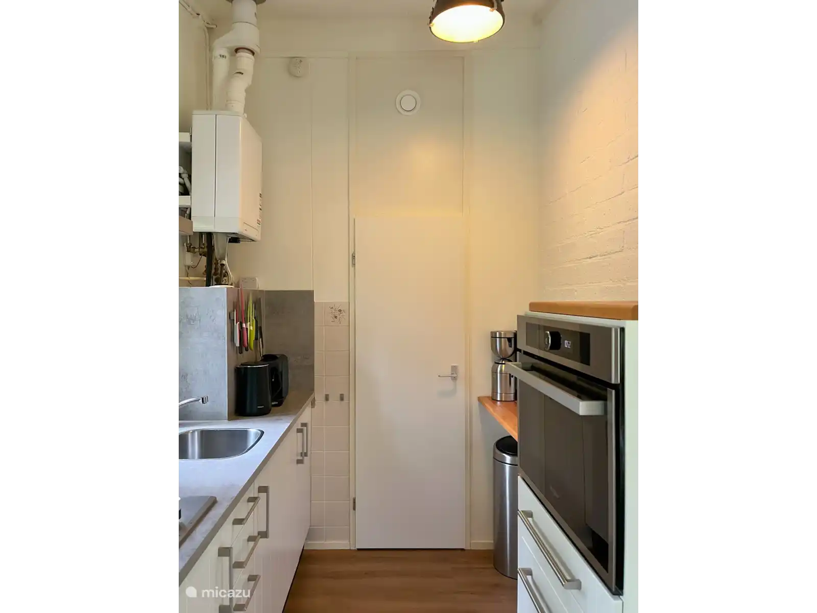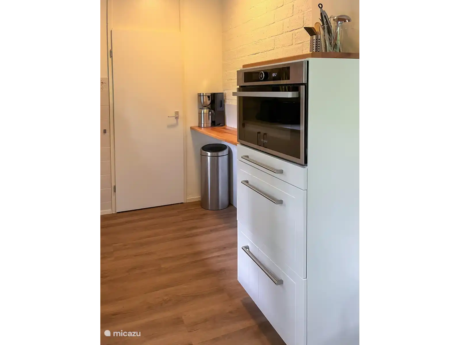 La cuisine ouverte est équipée d’un four mixte/micro-ondes, d’une machine Nespresso, d’un mousseur à lait, d’une bouilloire, d’un extracteur à presses, d’un mixeur à main et de diverses herbes.