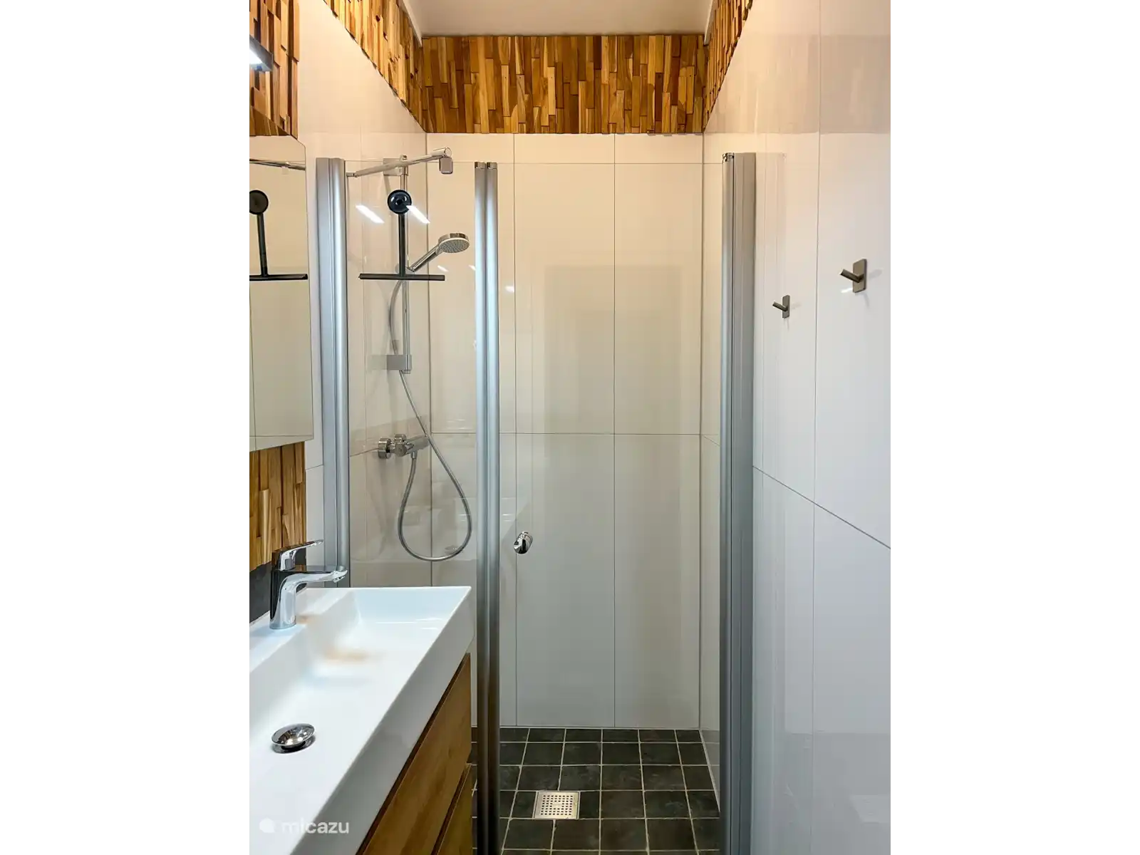 Il y a deux chambres, chacune avec un lit double (140x200 cm). Par la deuxième chambre, on entre dans la salle de bain et les toilettes (voir plan d’étage). La salle de bain dispose d’une douche spacieuse et d’un double lavabo. Les toilettes sont séparées.