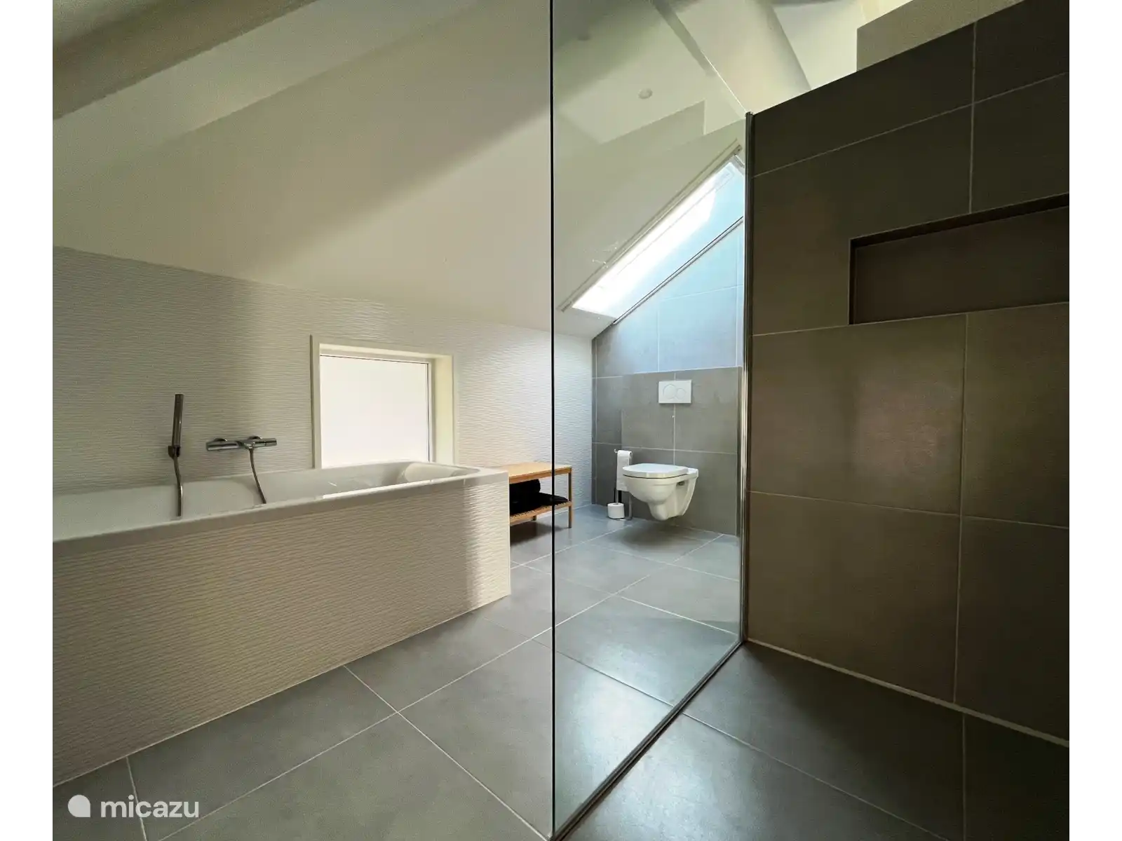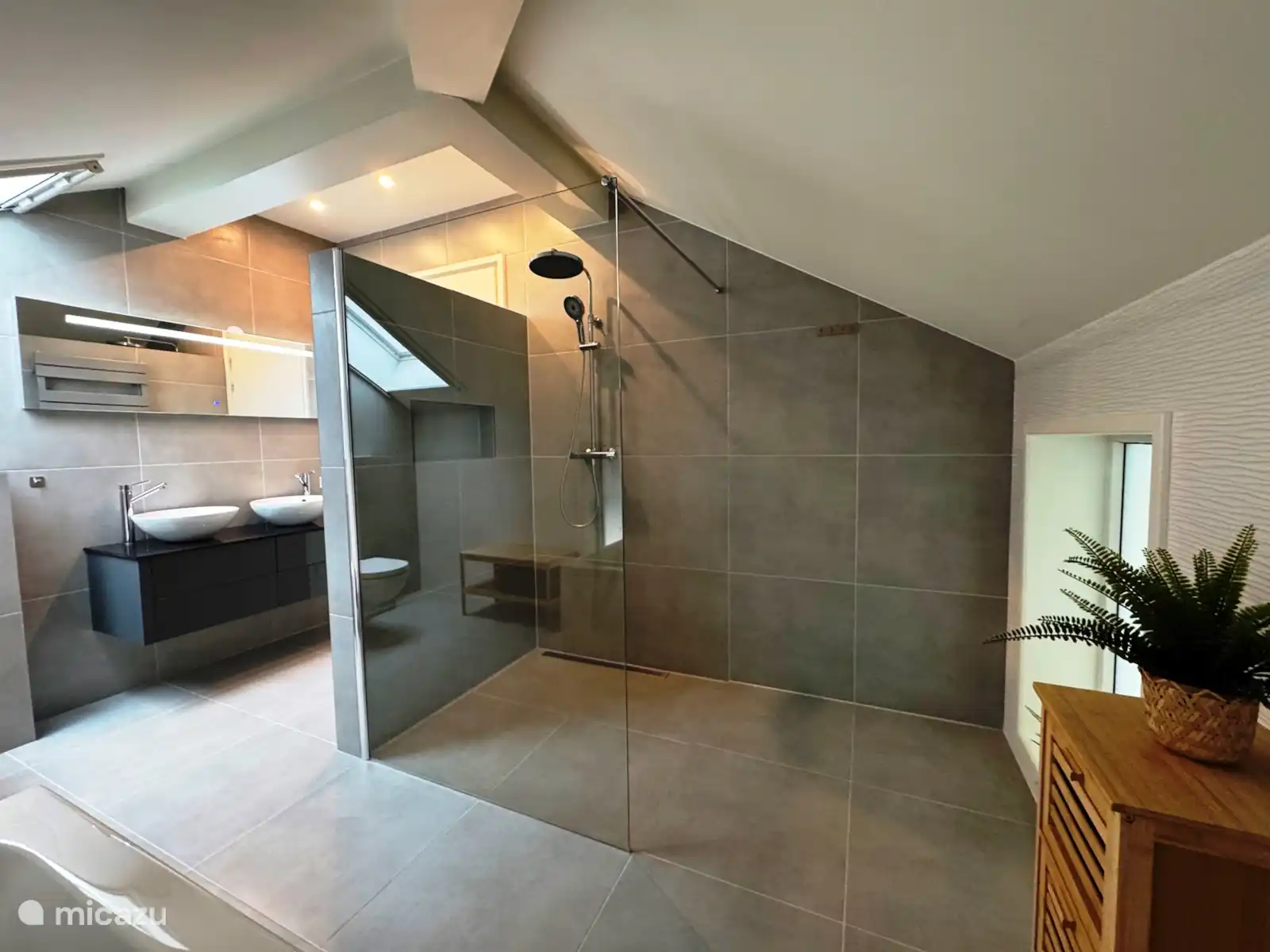 Salle de bain avec baignoire îlot, douche spacieuse, lavabo et toilettes.