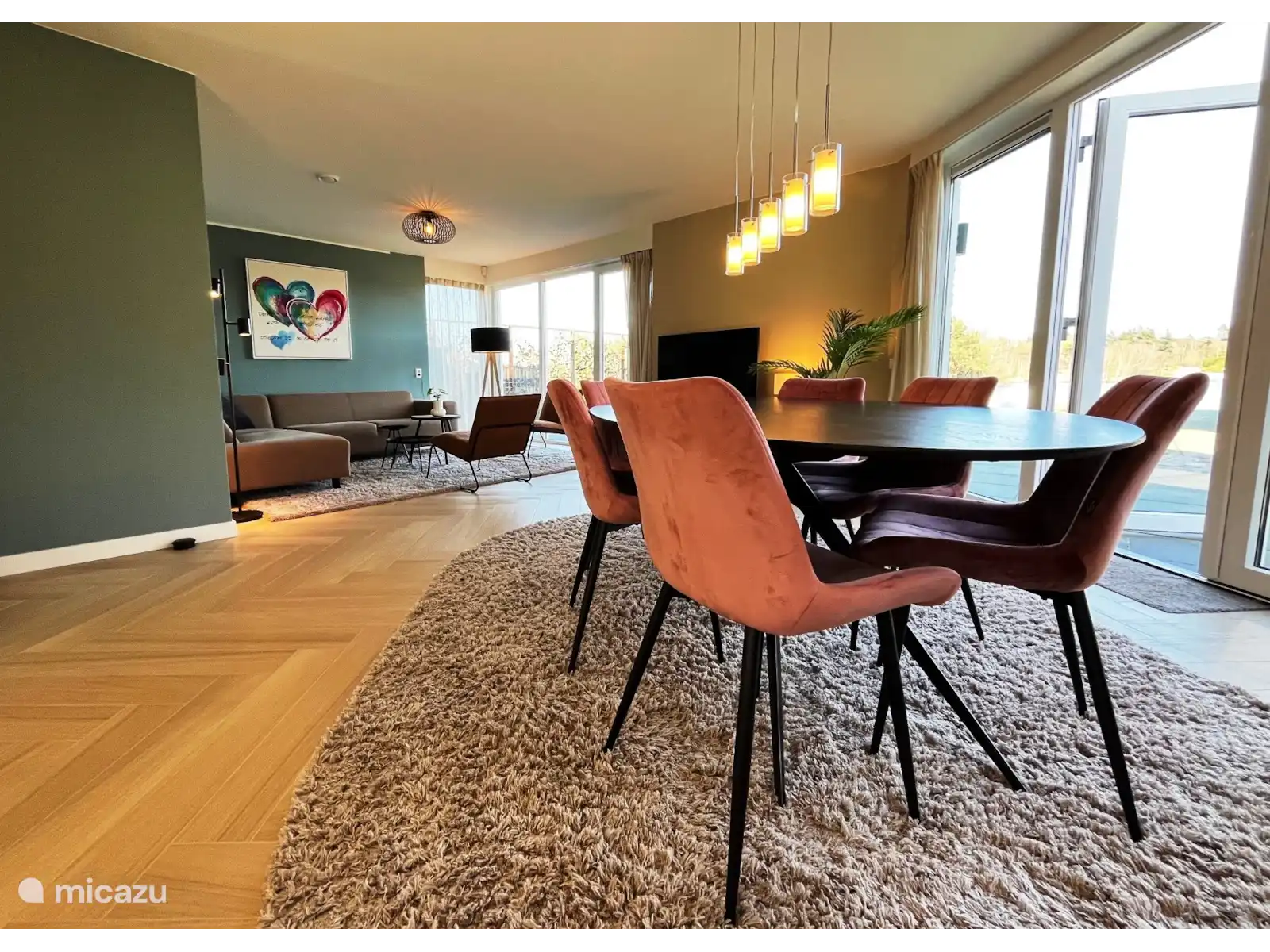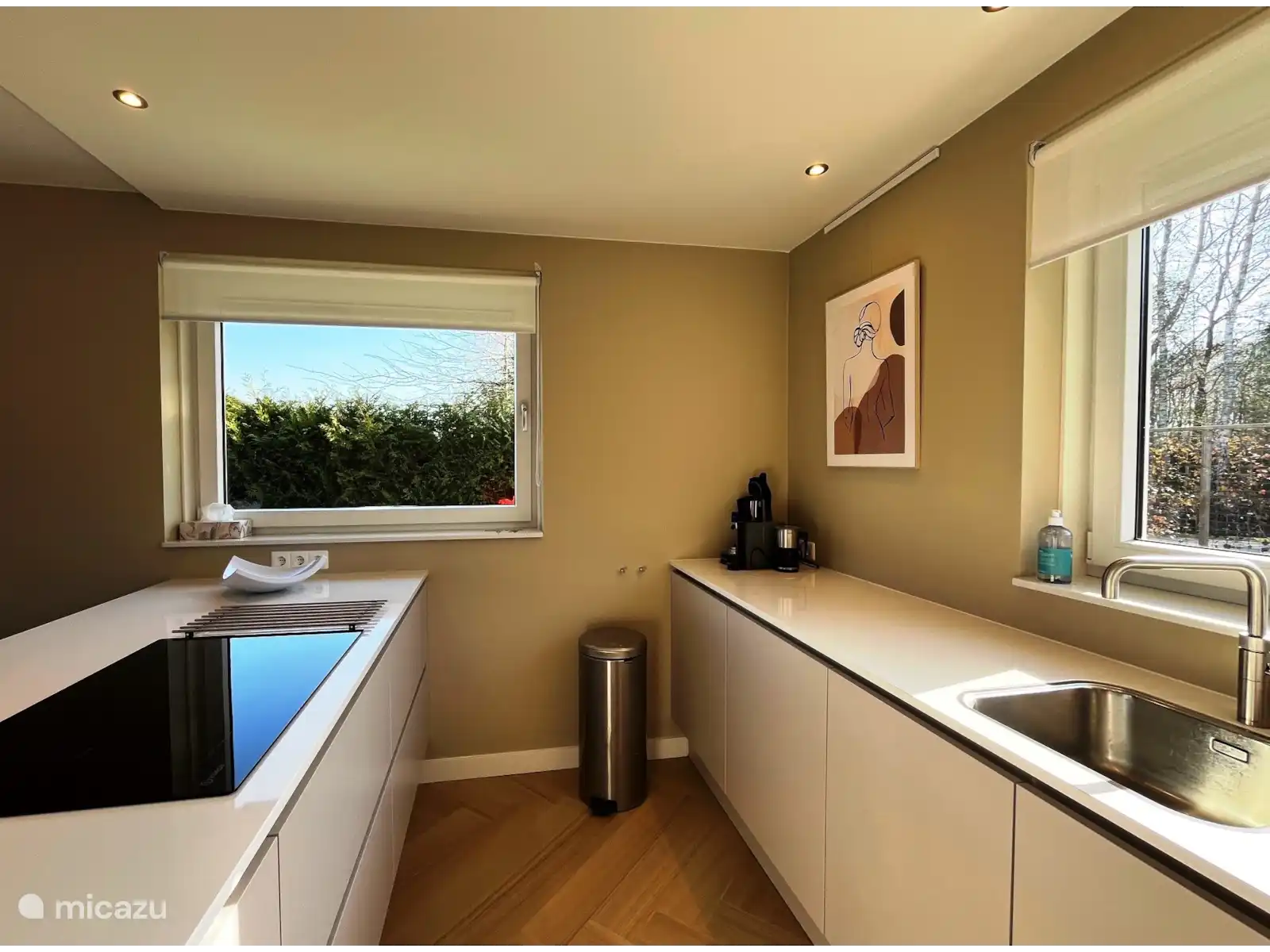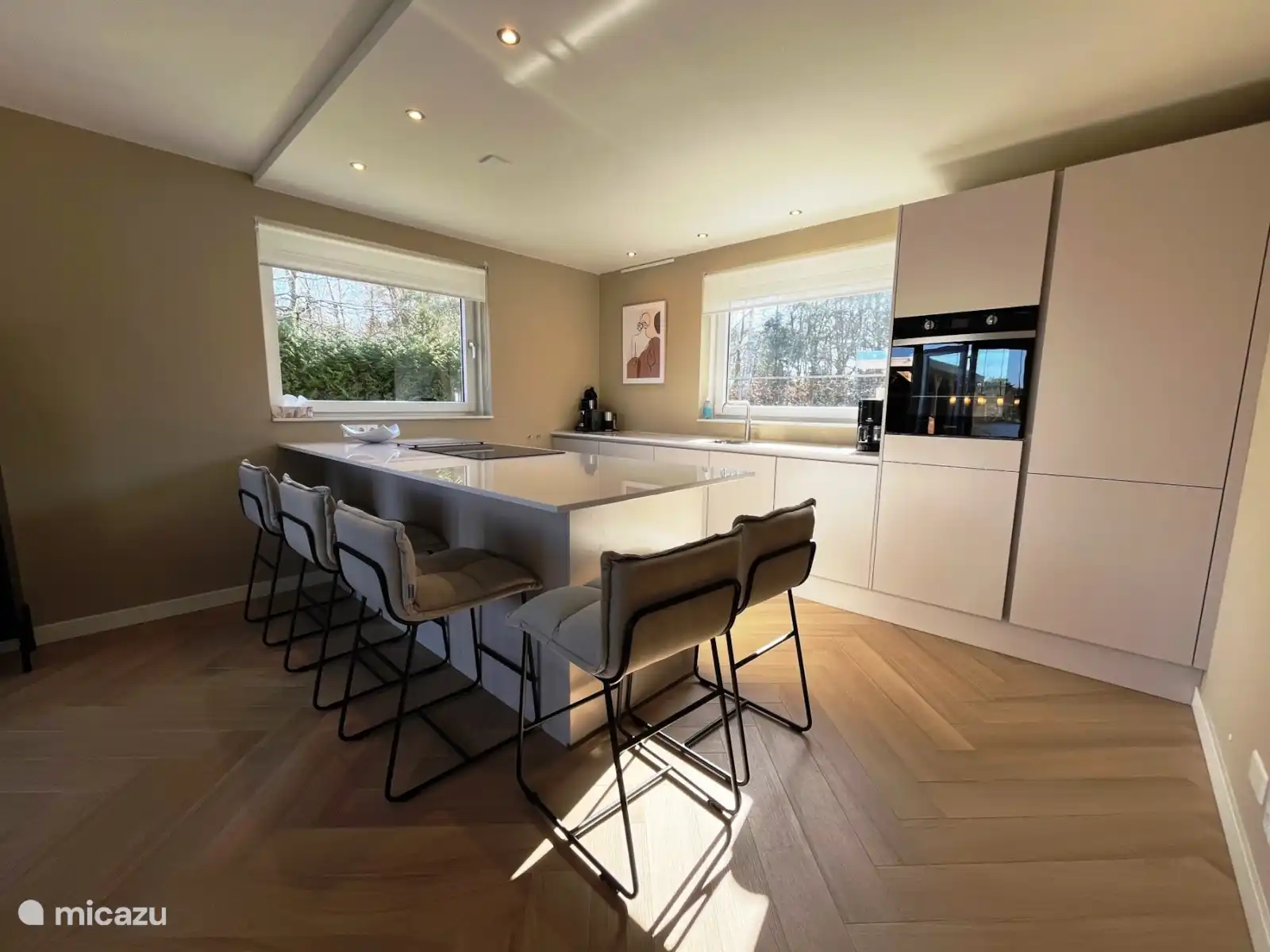 Cuisine ouverte avec îlot de cuisson avec plaque à induction, lave-vaisselle, réfrigérateur avec tiroirs de congélation, four, micro-ondes, lave-vaisselle, machine Nespresso (apportez vos propres tasses), cafetière filtre et bouilloire. Table à manger avec 6 chaises.