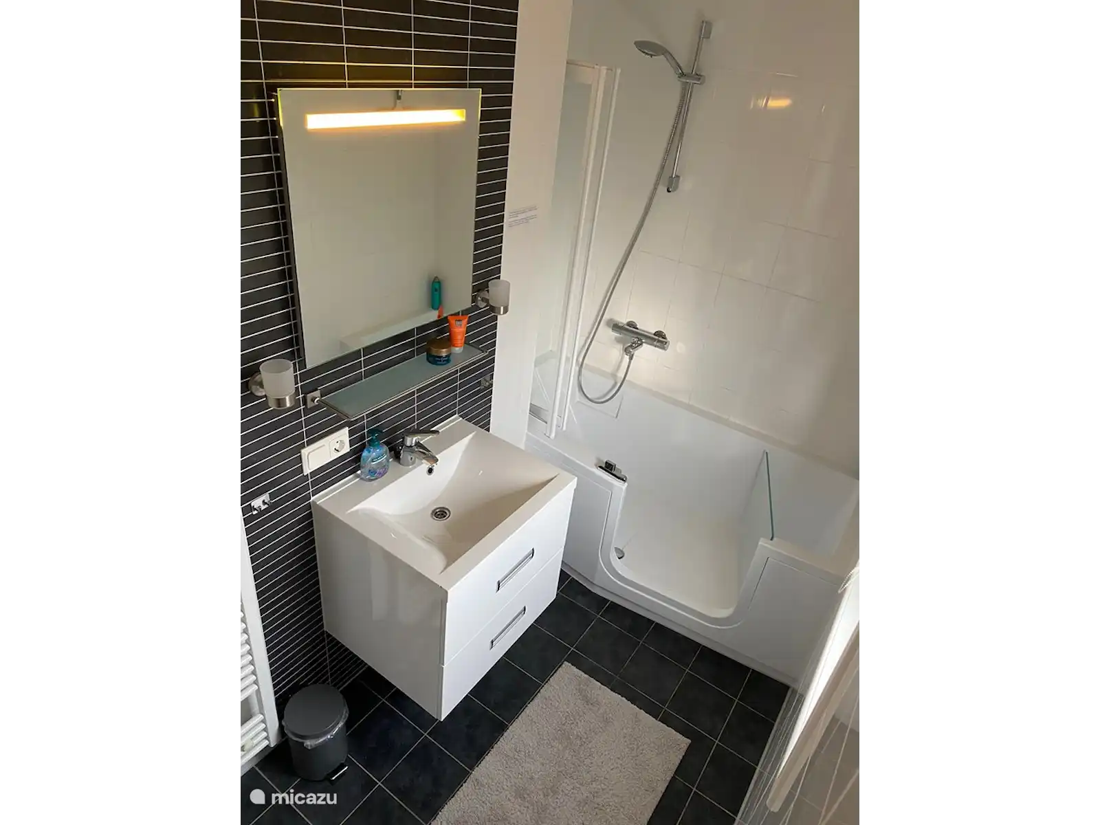 La salle de bain dispose d’une douche/baignoire, d’un lavabo et d’une toilette.