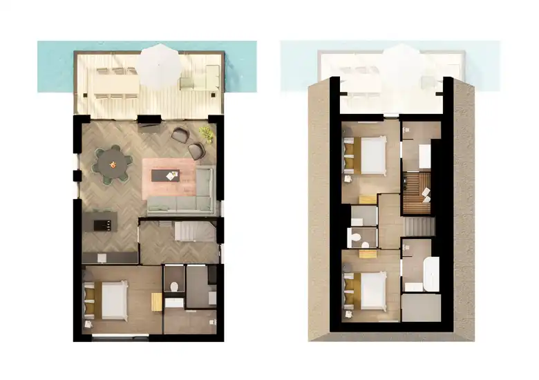 Par les portes-fenêtres, vous entrez dans la terrasse avec un ensemble de salon et un ensemble de salle à manger. La terrasse est située au-dessus de la crique et vous offre une jolie vue sur l’eau. L’endroit idéal pour dîner ou profiter d’une merveilleuse journée.