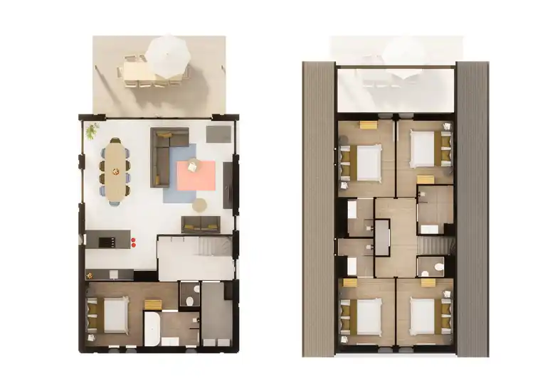 Au premier étage, vous avez accès à 4 chambres, chacune avec 2 lits simples, 1 chambre dispose d’une télévision intelligente avec capacité de streaming. De plus, 2 chambres disposent d’une salle de bains privative avec douche et lavabo. Du couloir, vous avez également accès à une troisième salle de bain avec douche, lavabo et toilettes. Il y a aussi des toilettes séparées au premier étage.