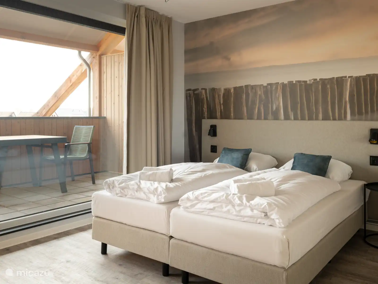 Au premier étage, il y a une chambre avec 2 lits simples, une télévision intelligente avec option de streaming et une salle de bain attenante avec baignoire, douche, lavabo spacieux et toilettes. De la chambre, vous avez également accès au balcon avec un siège confortable.