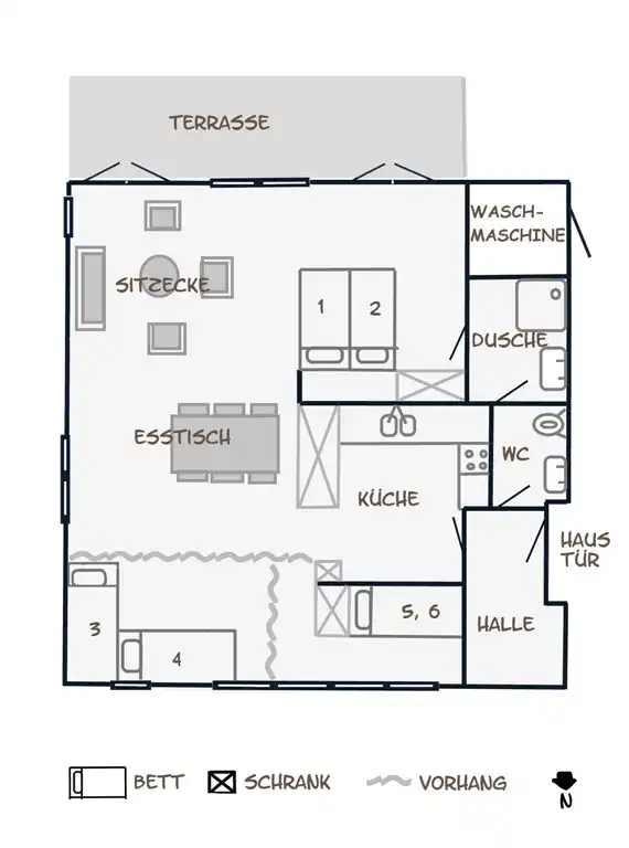 La maison a été rénovée en 1968. Le salon et les chambres ont ensuite été fusionnés en un seul grand espace. Il y a une cuisine semi-ouverte. Un total de six personnes peuvent dormir. Il est meublé simplement mais entièrement équipé. La maison est chauffée centralement. En novembre 2017, nous avons complètement renouvelé le chauffage central et l'approvisionnement en eau chaude. Les voitures peuvent être garées à l'intérieur de la porte.