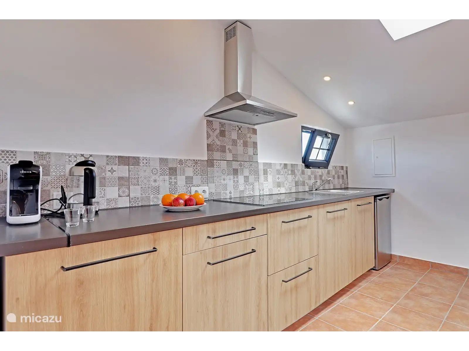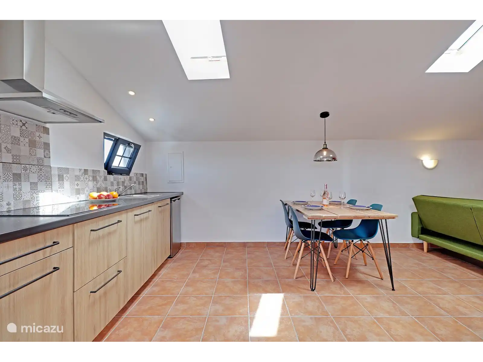 Télévision Android, coin repas et climatisation. La cuisine se compose d’une cuisine équipée avec plaque à induction, lave-vaisselle, lave-vaisselle,