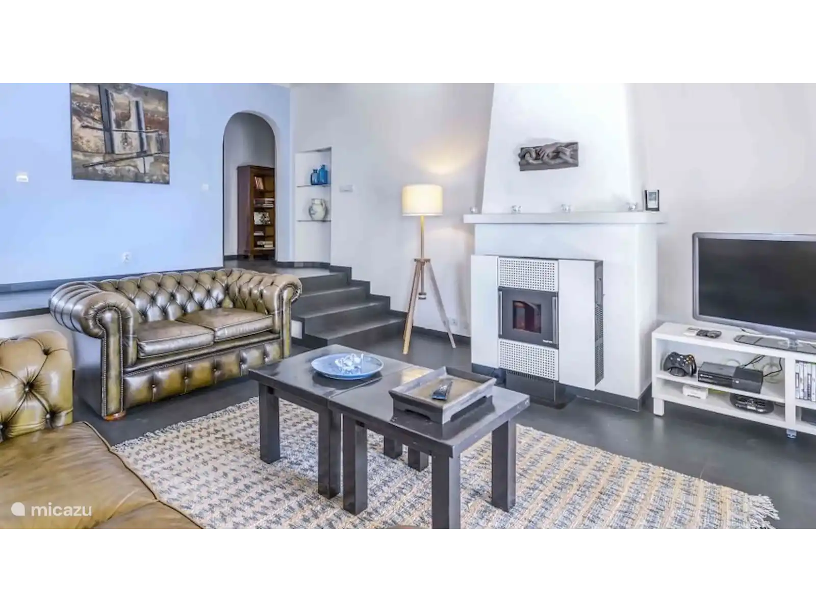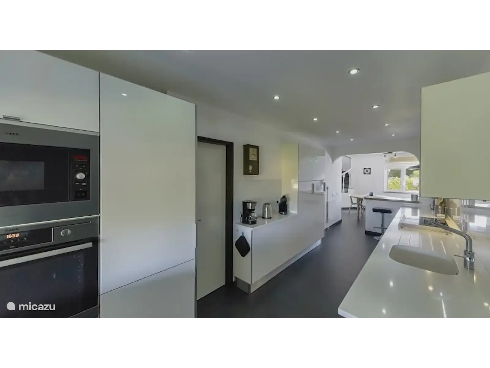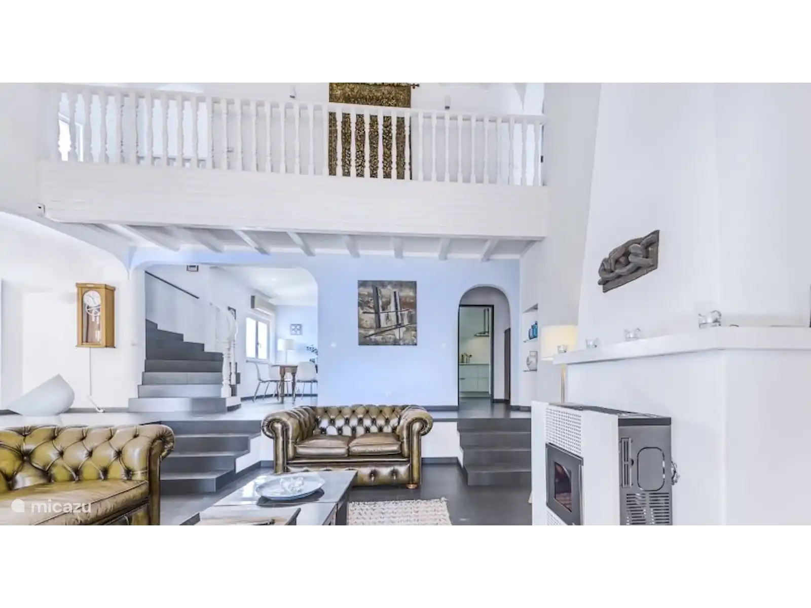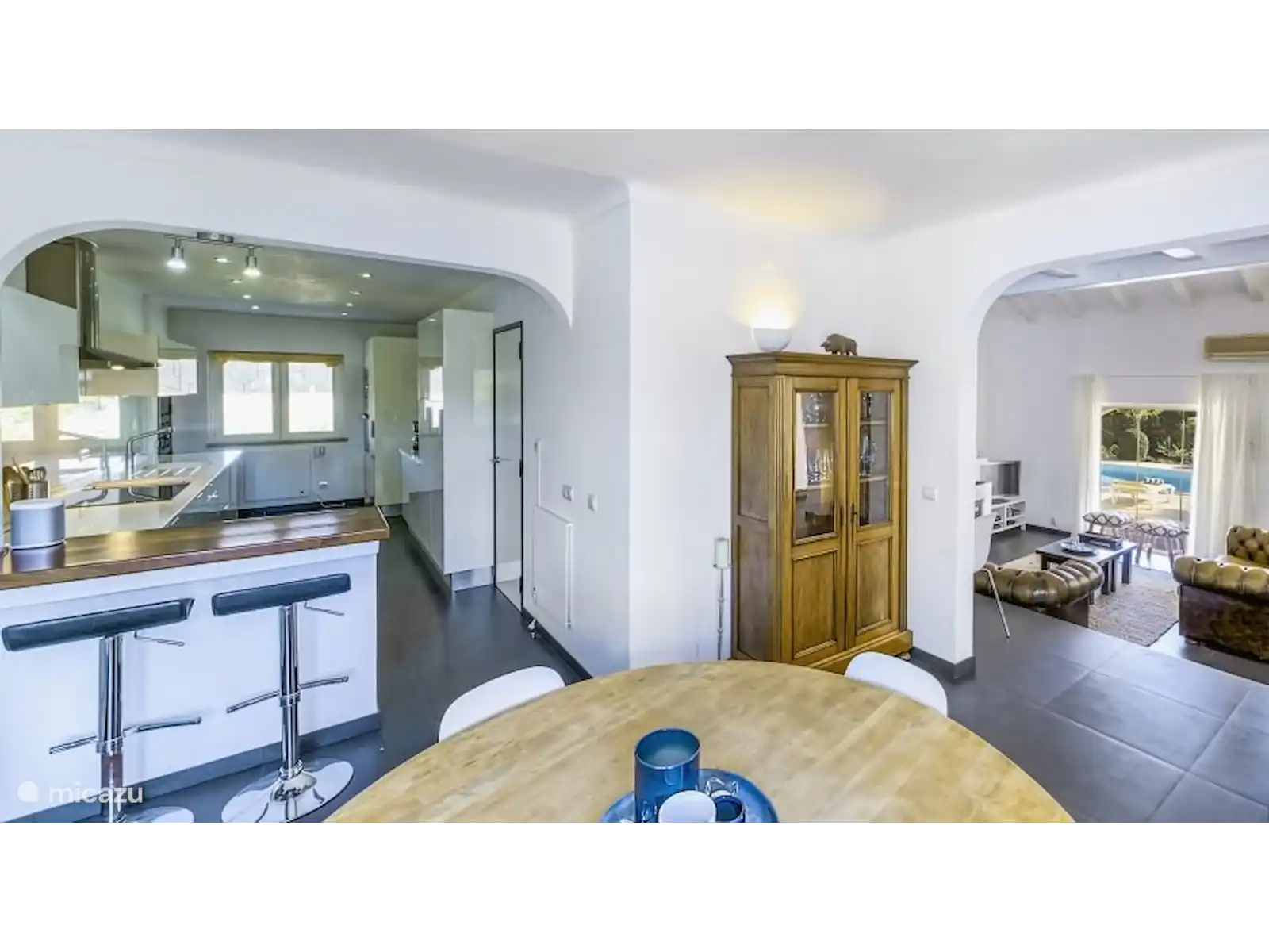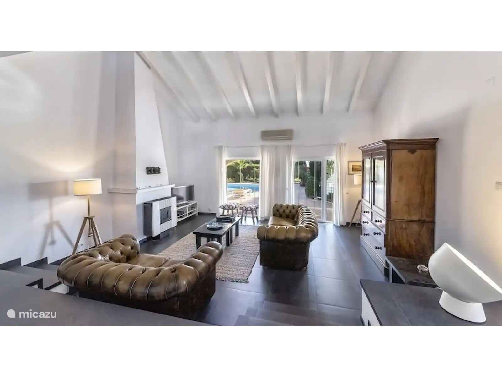 Rez-de-chaussée : Salon avec cheminée et poêle. Télévision avec console de jeux (xbox), 2 canapés deux places et 2 tabourets séparés. Vide. Le salon est climatisé et donne accès à une terrasse extérieure séparée, équipée d’une paroi vitrée coulissante. Toilettes invités séparées. Cuisine moderne avec table à manger et chaises. La cuisine est d’un blanc brillant et équipée de tous les équipements nécessaires, tels qu’un lave-vaisselle, un réfrigérateur avec compartiment congélateur, une machine à café (filtre + tasses), une bouilloire, un mixeur plongeant, un presse-agrumes, un mixeur).