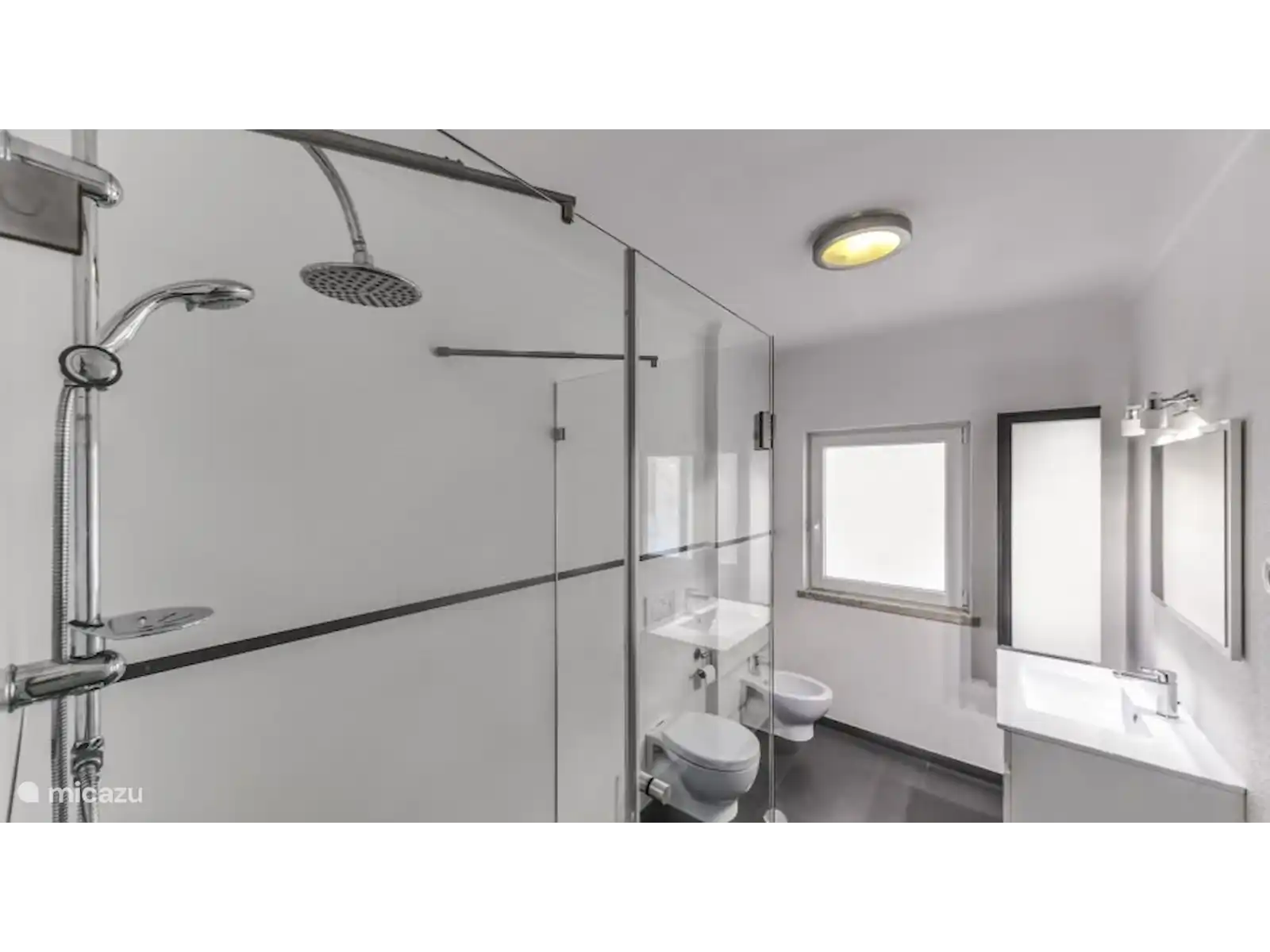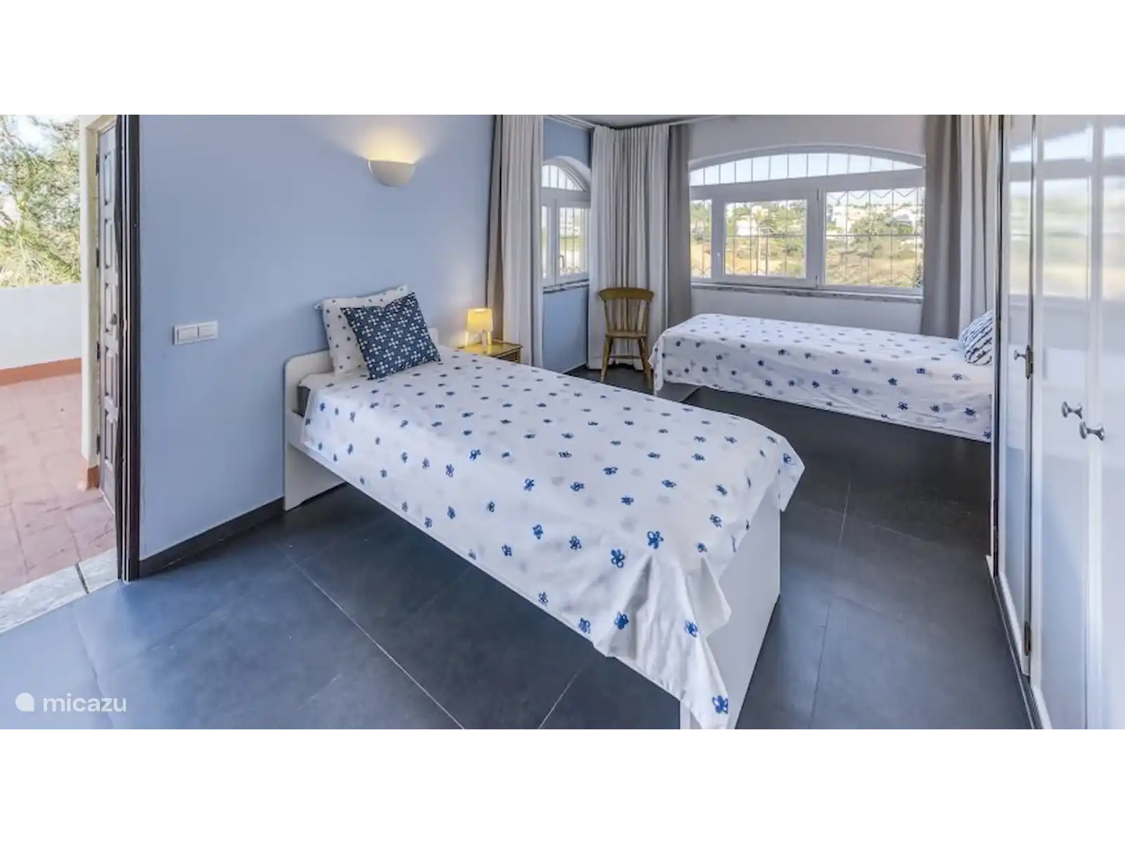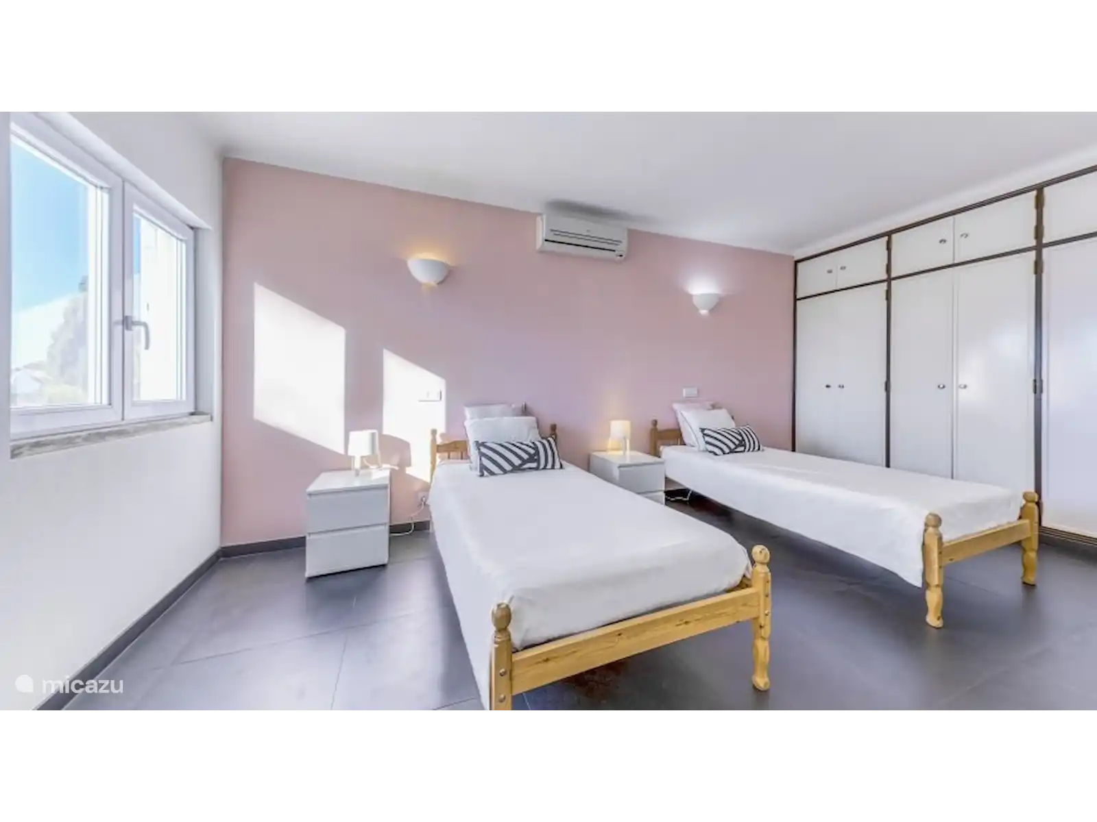 Il y a aussi 2 chambres avec deux lits simples et une salle de bain qui est partagée par les chambres à l’étage. La salle de bain dispose d’une douche, d’un bidet, de toilettes et d’un double lavabo.