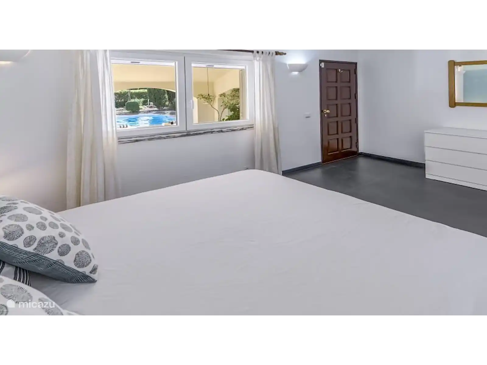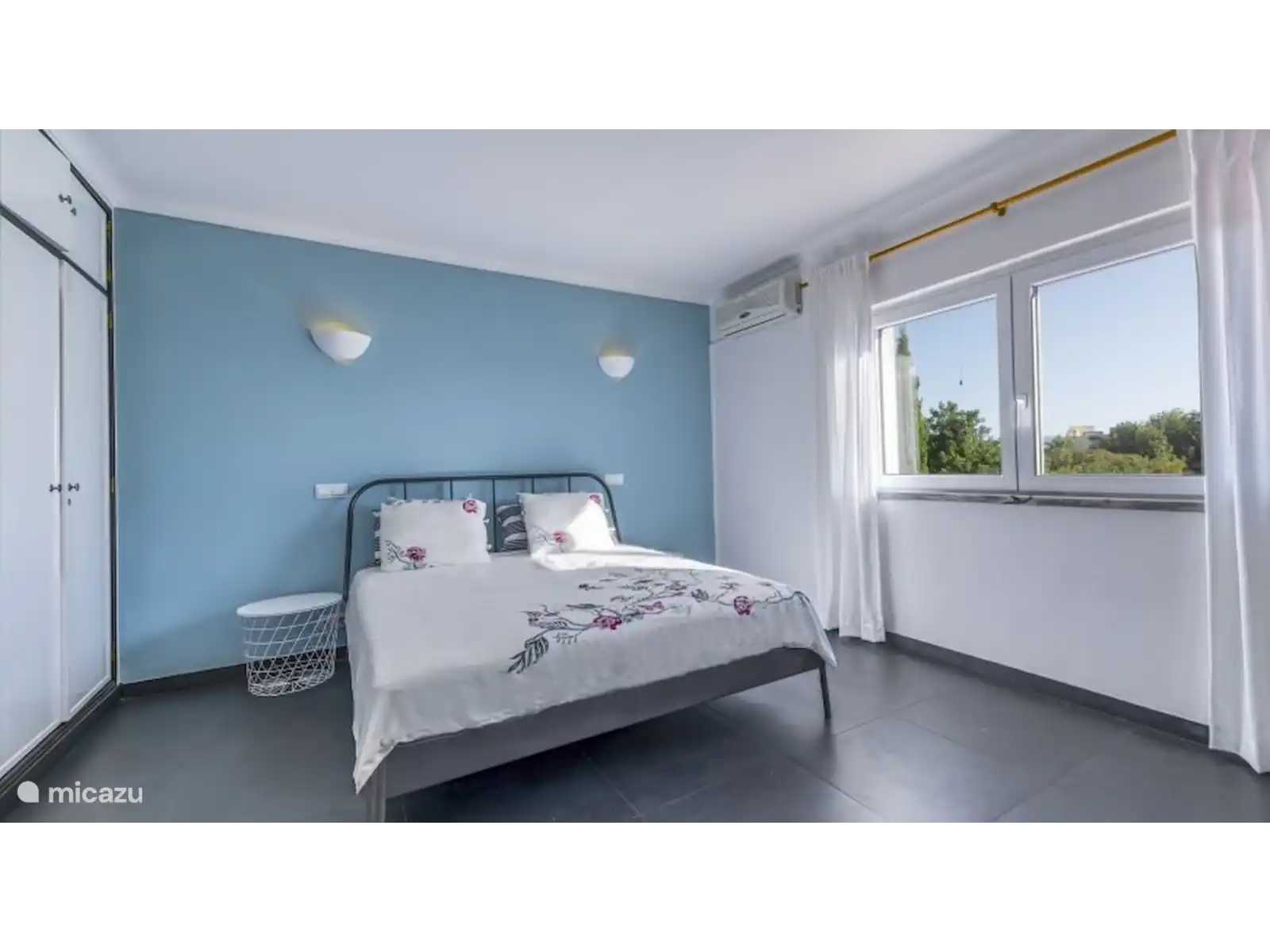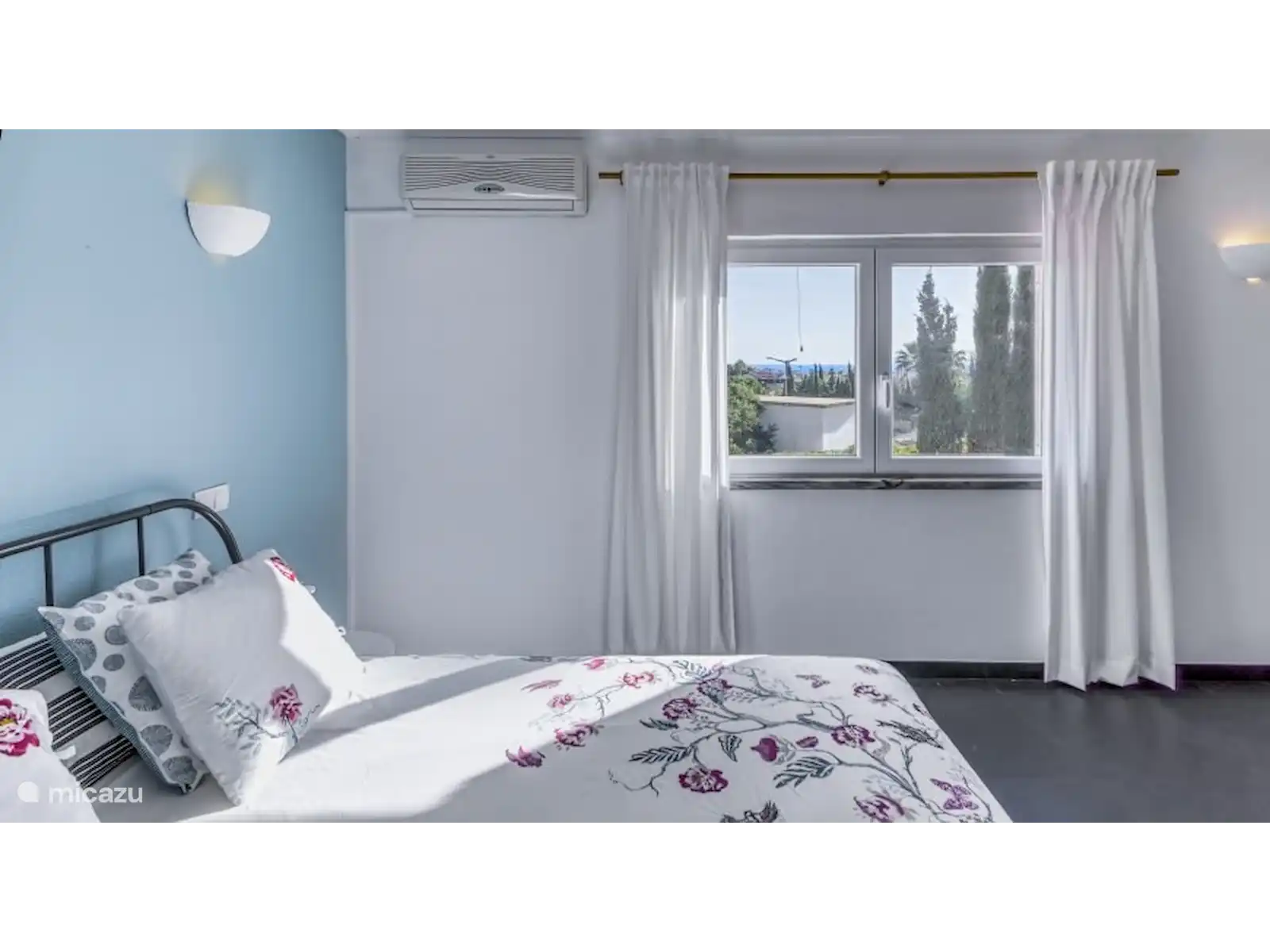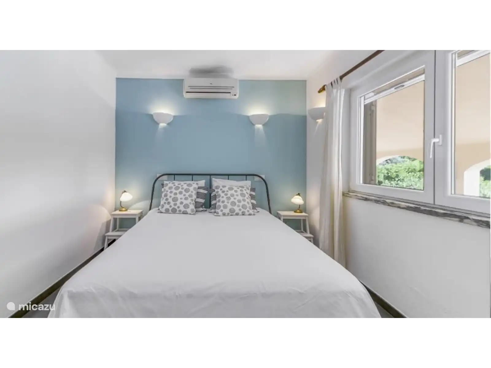 A l’étage : chambre double avec climatisation. La chambre a une vue magnifique sur la mer et donne sur la piscine.