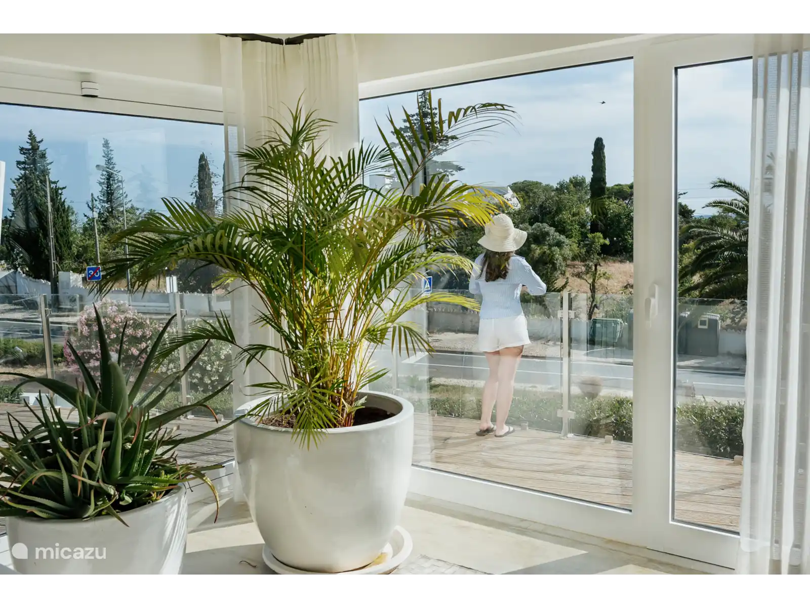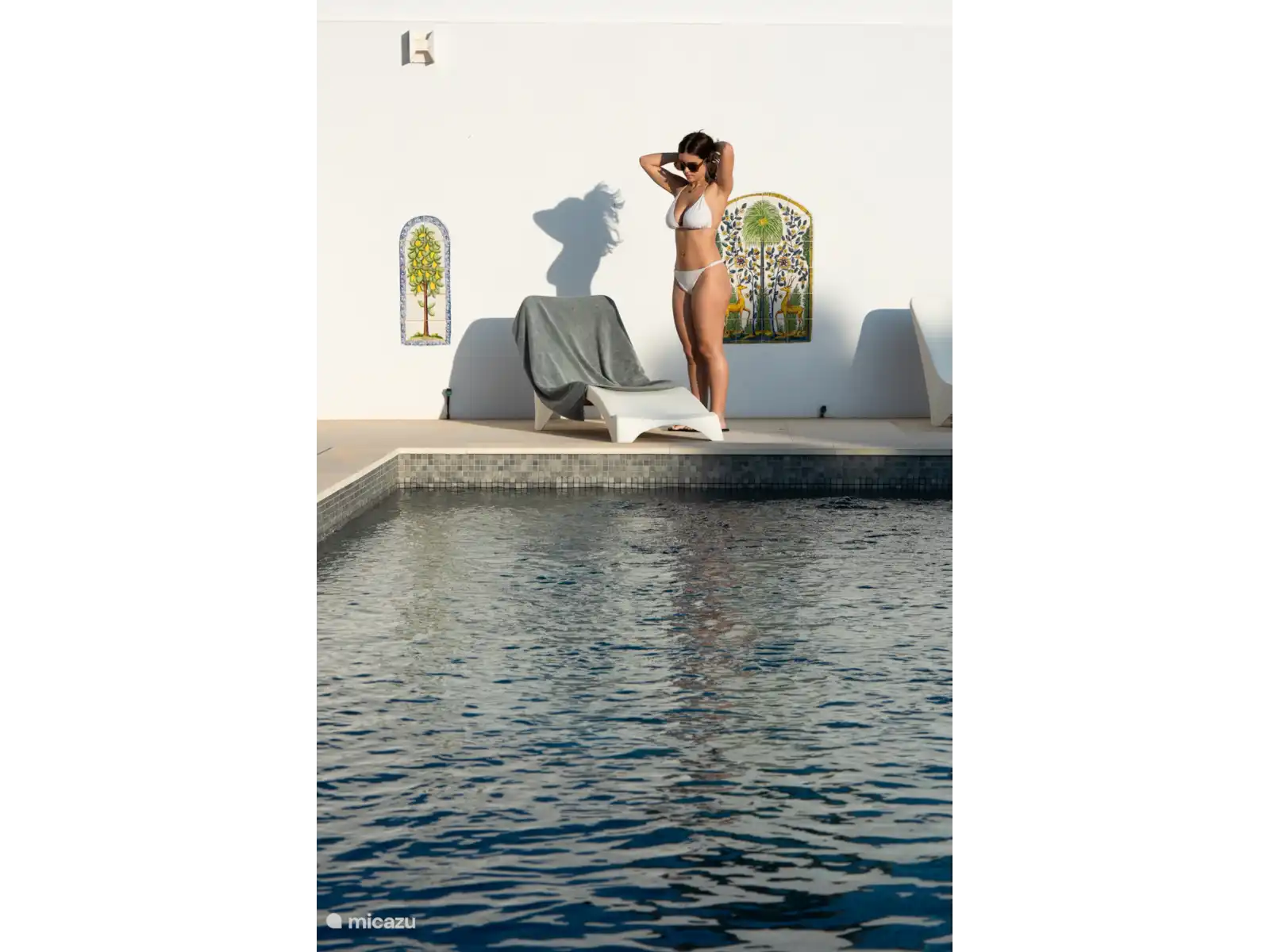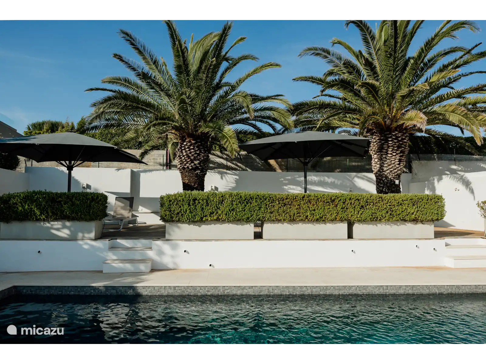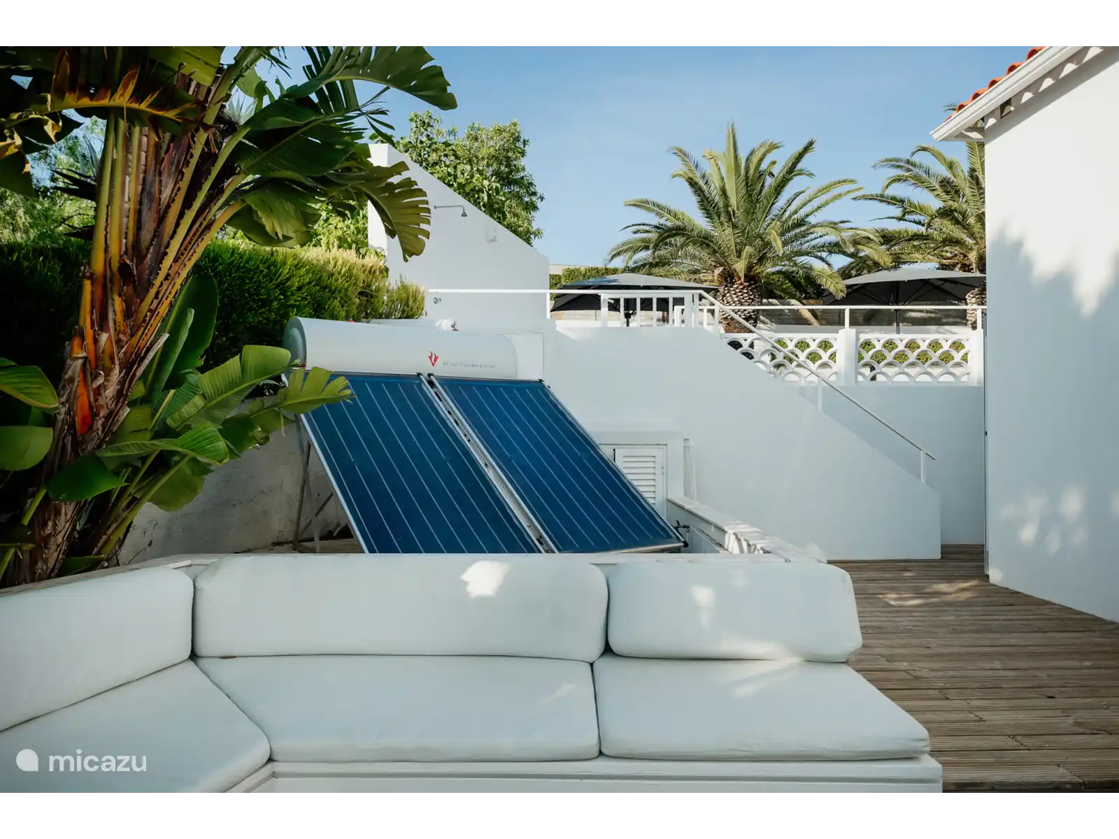 À l’arrière se trouve une piscine (10 x 4,5 x moyenne 1,75 avec éclairage sous-marin) au milieu d’une grande terrasse de salon. Sur l’un des nombreux transats, il est bon de rester ici sous les palmiers. Les marches de la piscine peuvent être fermées par un portail pour la sécurité des enfants. Bien sûr, il y a une douche extérieure et des serviettes de bain. Enfin, il y a la terrasse sur le toit d’où vous pourrez profiter de la vue spéciale.