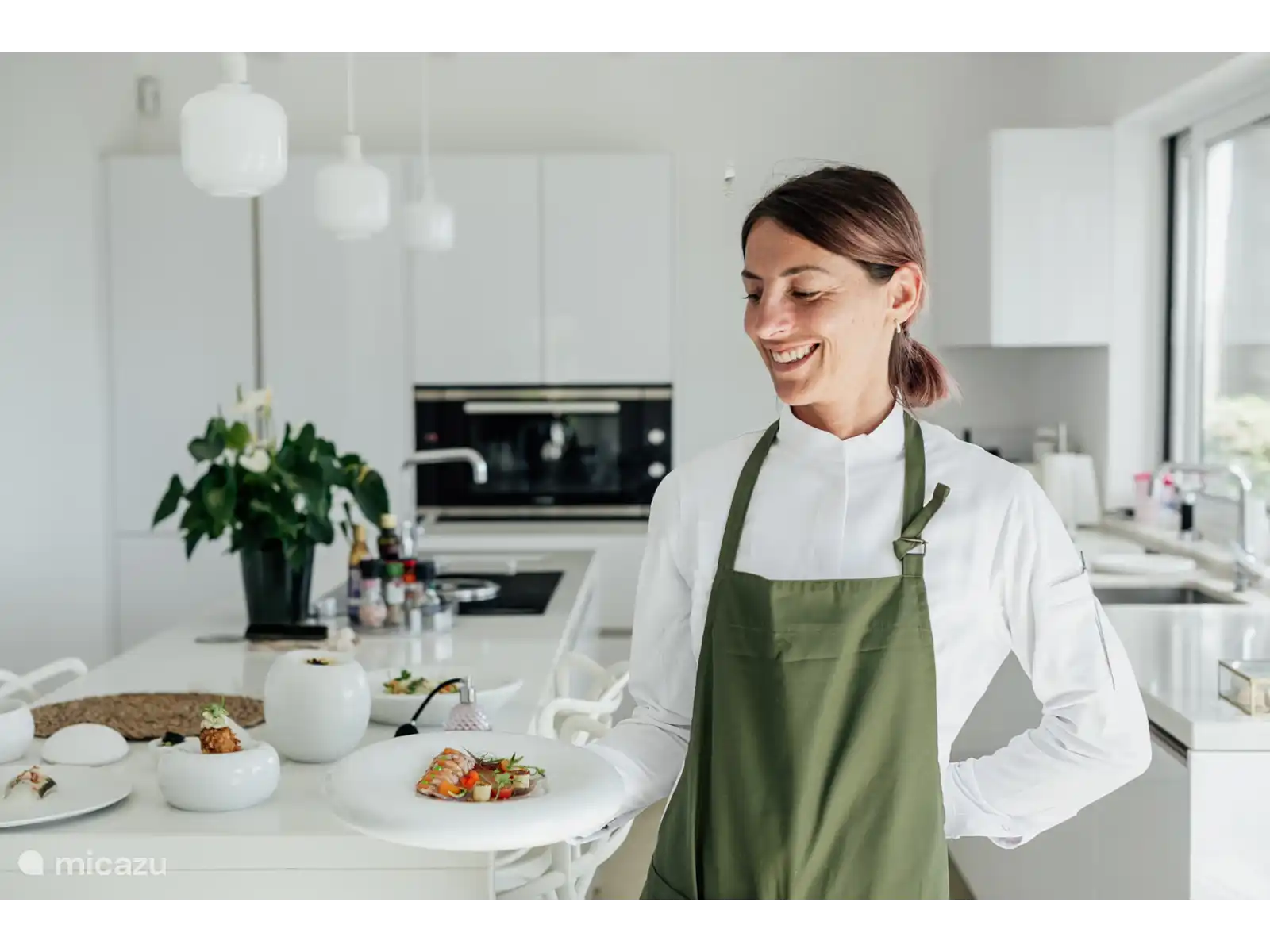 La cuisine semi-ouverte dispose d’un îlot de cuisson où vous pourrez vous installer sur un tabouret de bar à quatre. La cuisine est équipée de tout l’équipement nécessaire (sauf micro-ondes). Il y a un réfrigérateur américain de Smeg, un four encastrable Bosch, une plaque à induction avec système d’extraction Bora et un lave-vaisselle et une machine à laver.