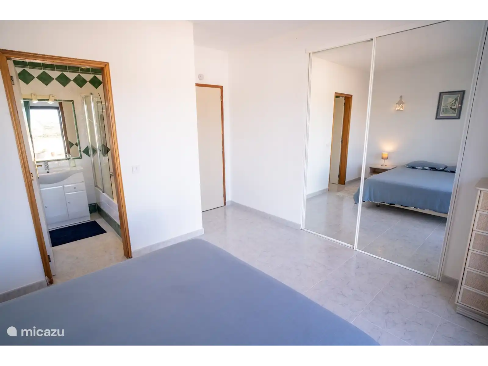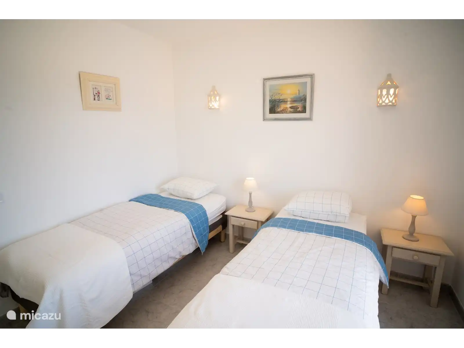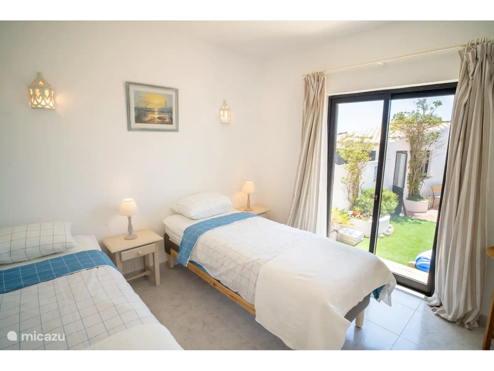 La villa se compose de deux étages, avec 3 chambres au rez-de-chaussée. De chaque chambre, vous pouvez marcher directement dans le jardin. Il y a de bons stores pare-soleil, vous pouvez donc dormir au frais et dans l’obscurité et il y a des ventilateurs disponibles. L’une des chambres dispose d’une salle de bain attenante avec baignoire et toilettes. Il y a aussi une salle de bain séparée avec douche et toilettes. Les deux autres chambres ont chacune deux sommiers tapissiers pour 1 personne.
