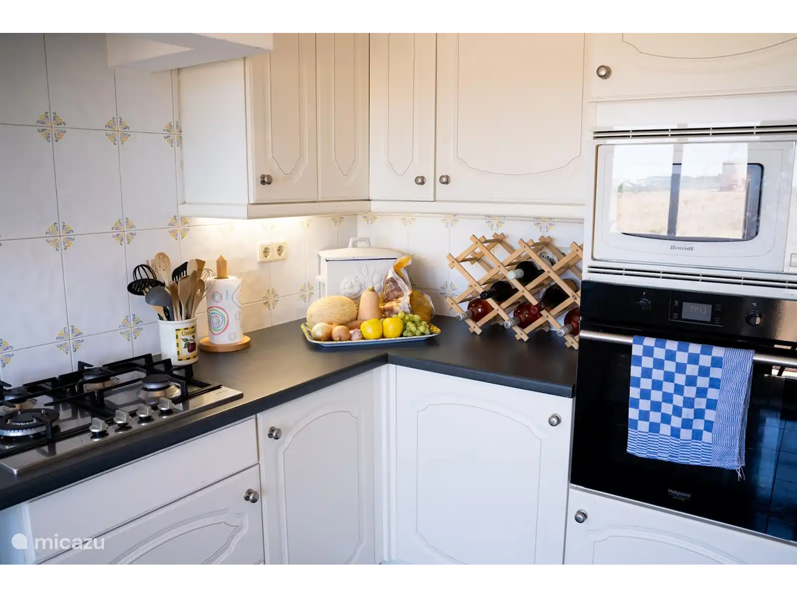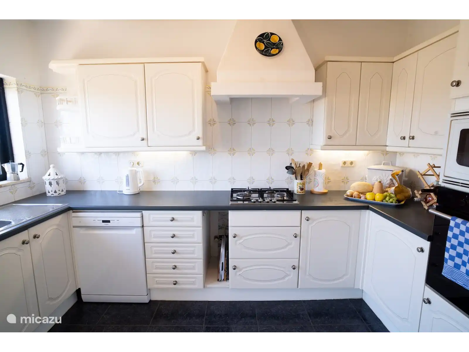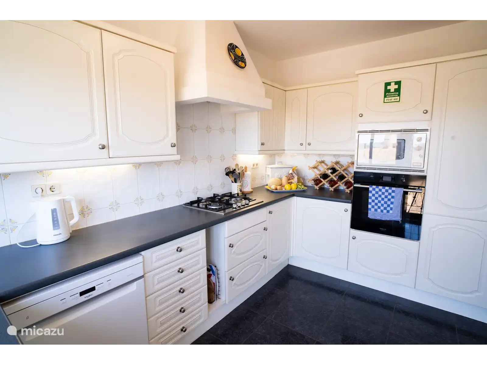 À l’étage supérieur, vous trouverez le spacieux salon ouvert avec coin salon et télévision, et un coin repas avec 6 chaises. De plus, il y a une cuisine complète avec toutes les commodités et appareils, y compris le four, le micro-ondes et le lave-vaisselle. Textiles de cuisine disponibles. A l’étage, il y a des toilettes séparées.
