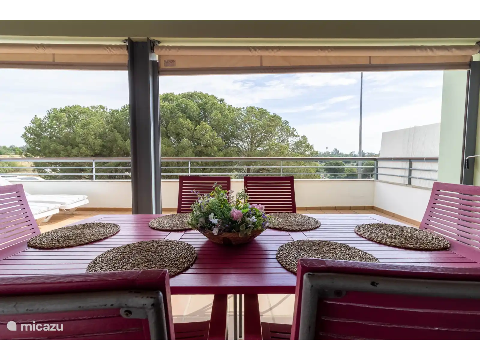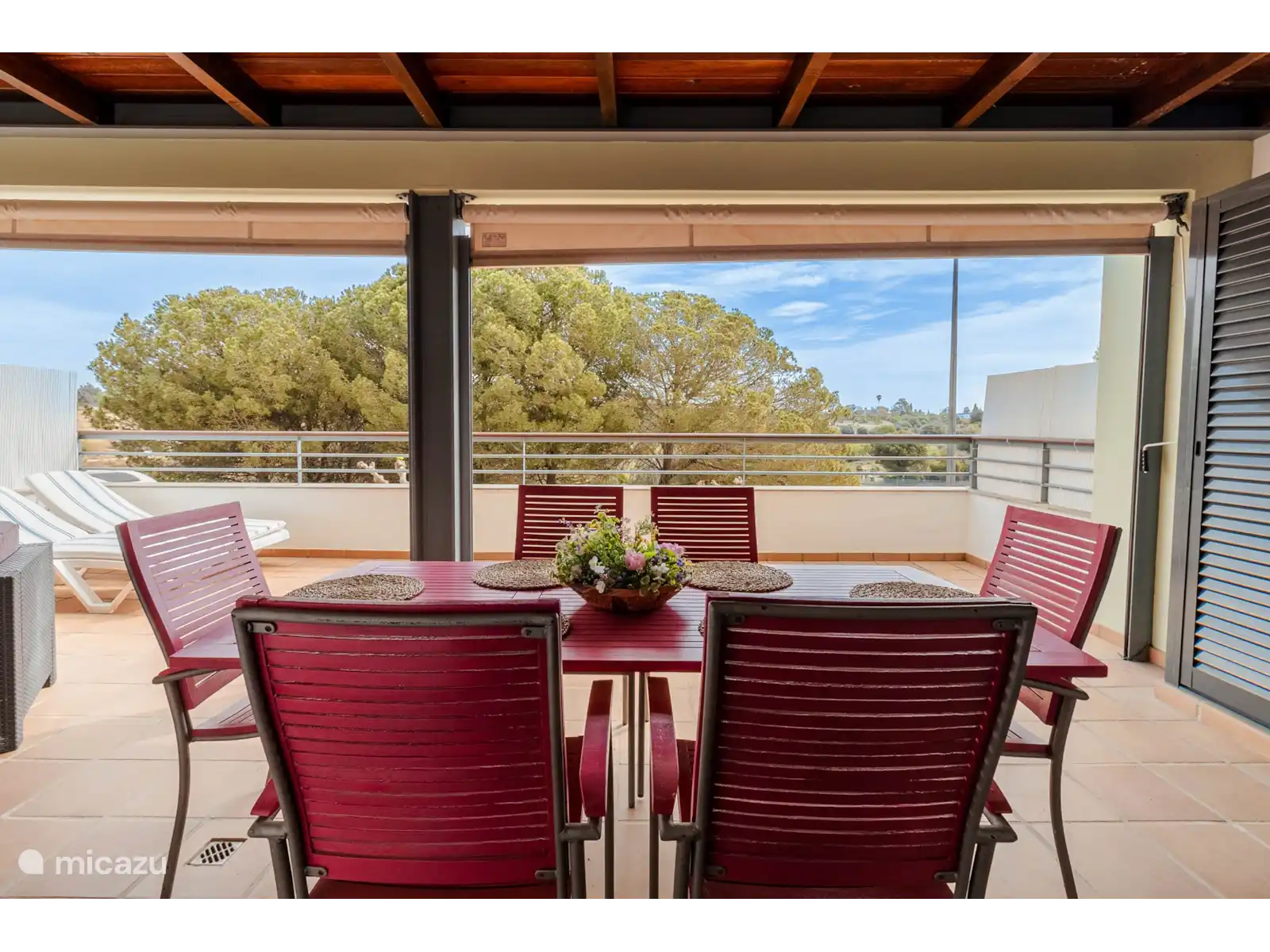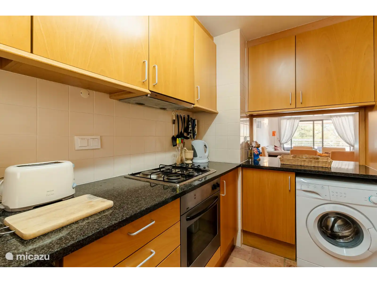Cet appartement de deux chambres est très lumineux et dispose d'une immense terrasse avec une vue magnifique et paisible sur les jardins et le paysage de la copropriété. La chambre principale dispose d'une salle de douche attenante et d'un accès direct à la terrasse. La deuxième chambre dispose de deux lits simples et est soutenue par une autre salle de bain avec baignoire. La cuisine est entièrement équipée avec tout ce dont vous avez besoin, notamment un lave-linge et un lave-vaisselle.