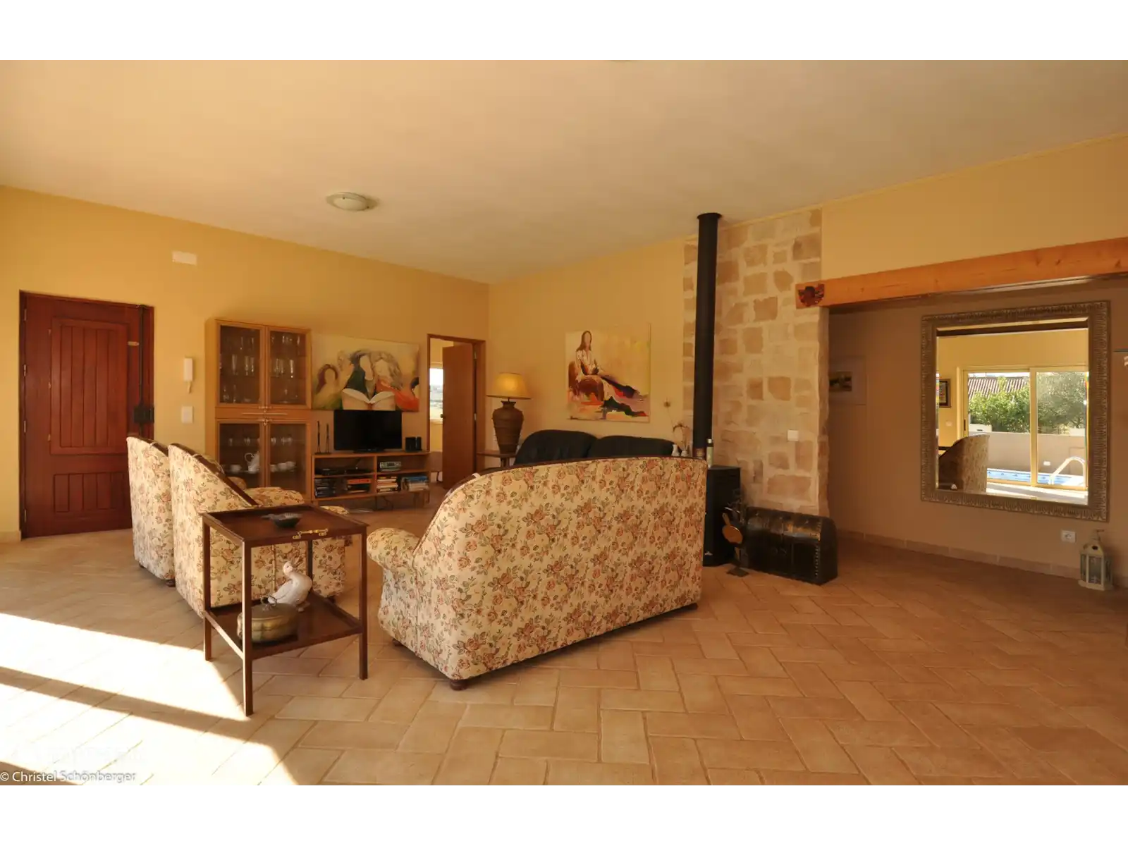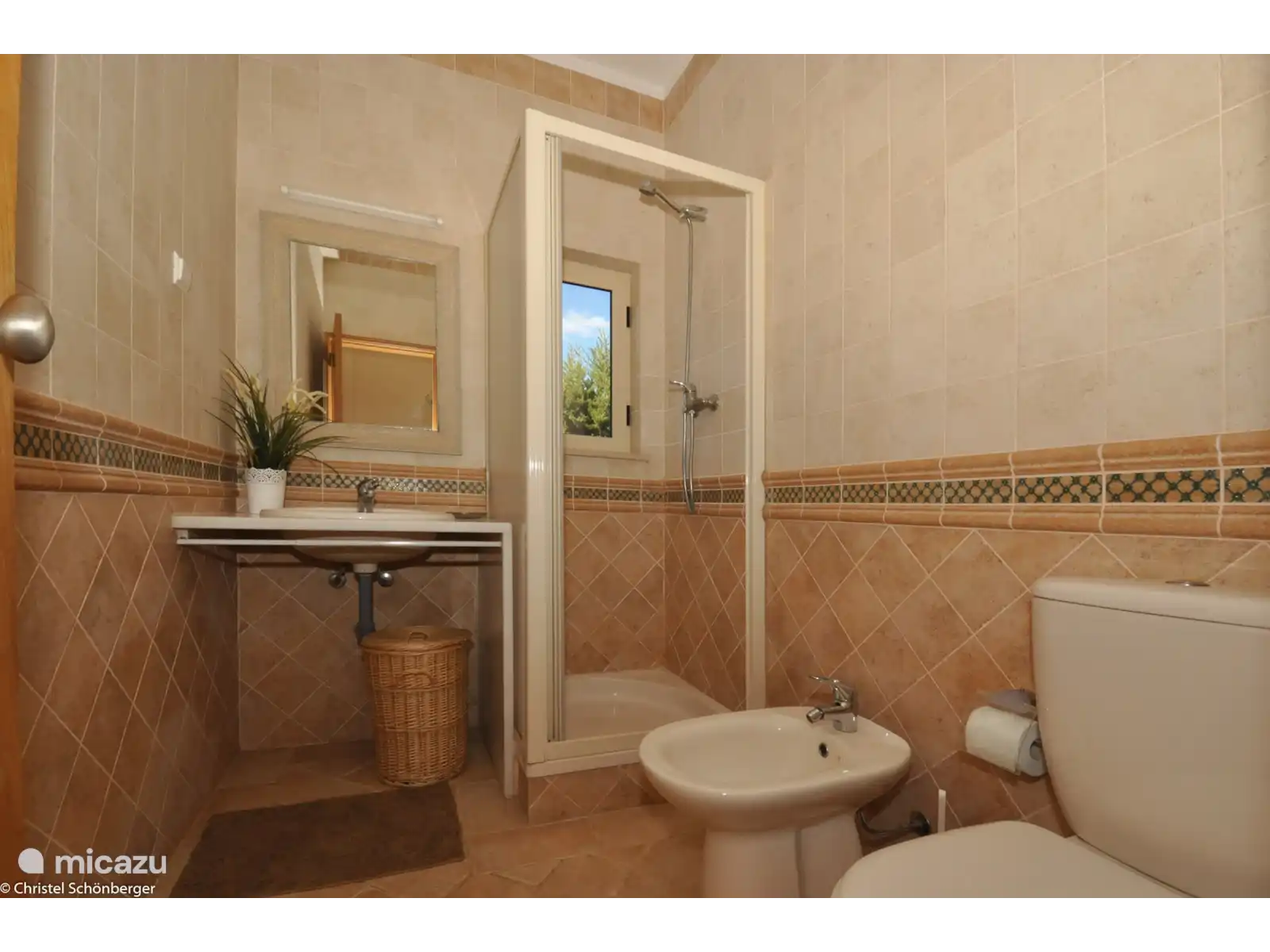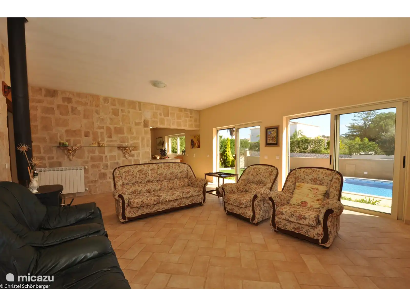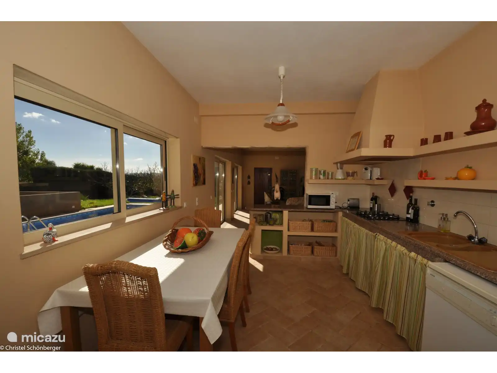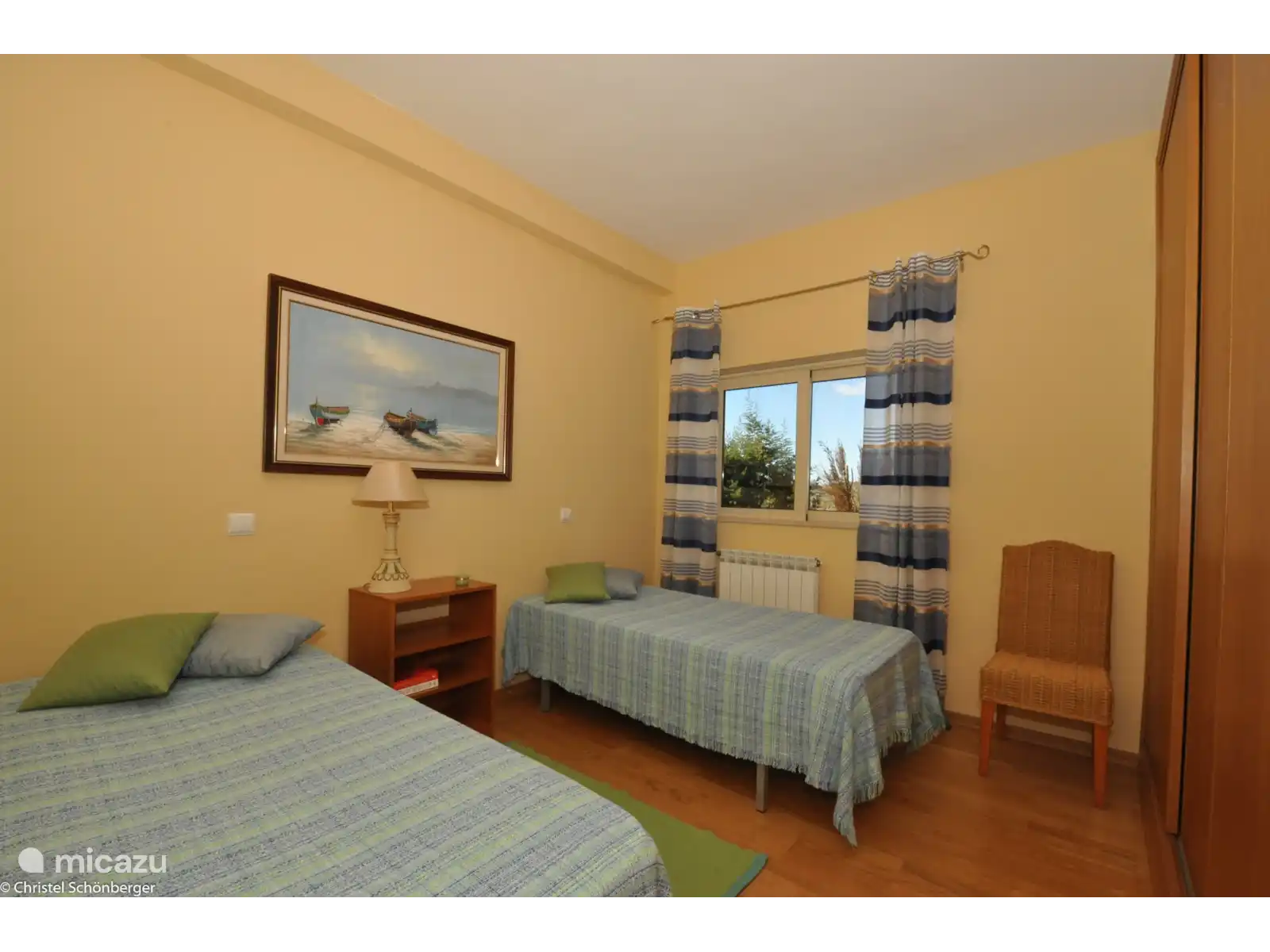 Composé d'une chambre principale ensuite, d'une deuxième chambre avec deux lits simples, d'une troisième chambre avec un lit simple, de deux salles de bains (une avec baignoire et une avec douche), d'une cuisine entièrement équipée et d'un salon spacieux avec accès au jardin. et piscine.