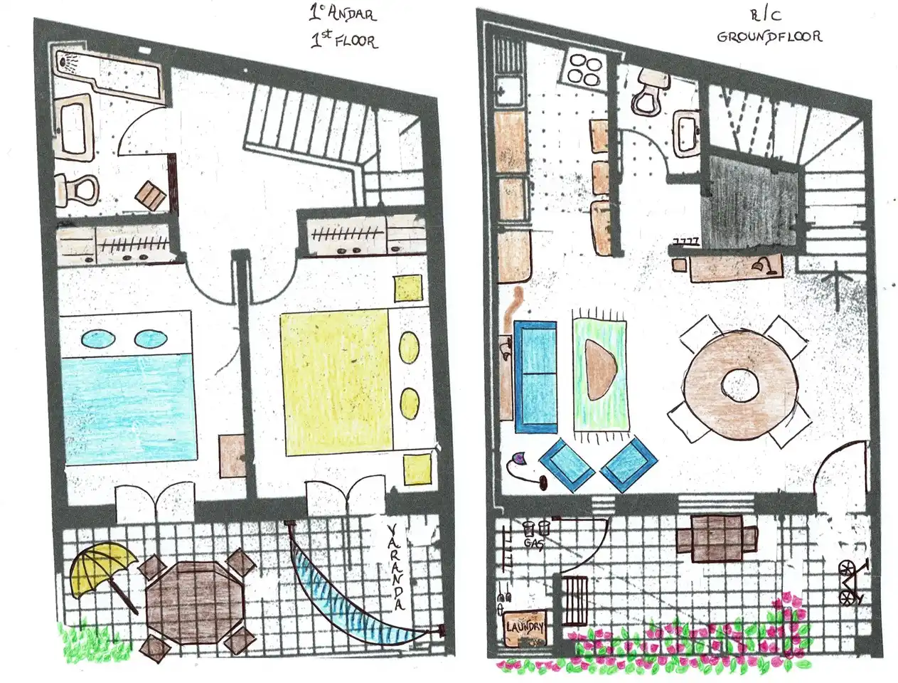 En haut des escaliers, vous avez accès aux 2 chambres, à la salle de bains et à une belle véranda avec vue sur l'océan où vous pourrez prendre un petit-déjeuner inspirant ou vous détendre dans le hamac.