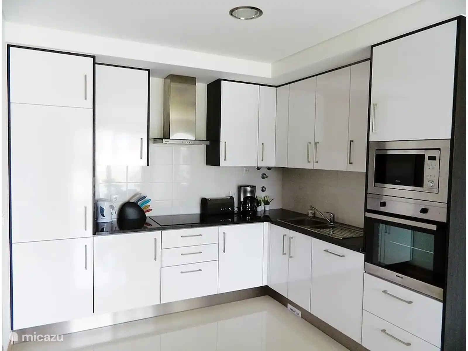 Cuisine : Cuisine avec des appareils modernes. Cafetière, lave-vaisselle, plaque à induction, micro-ondes, grille-pain, four, machine à laver