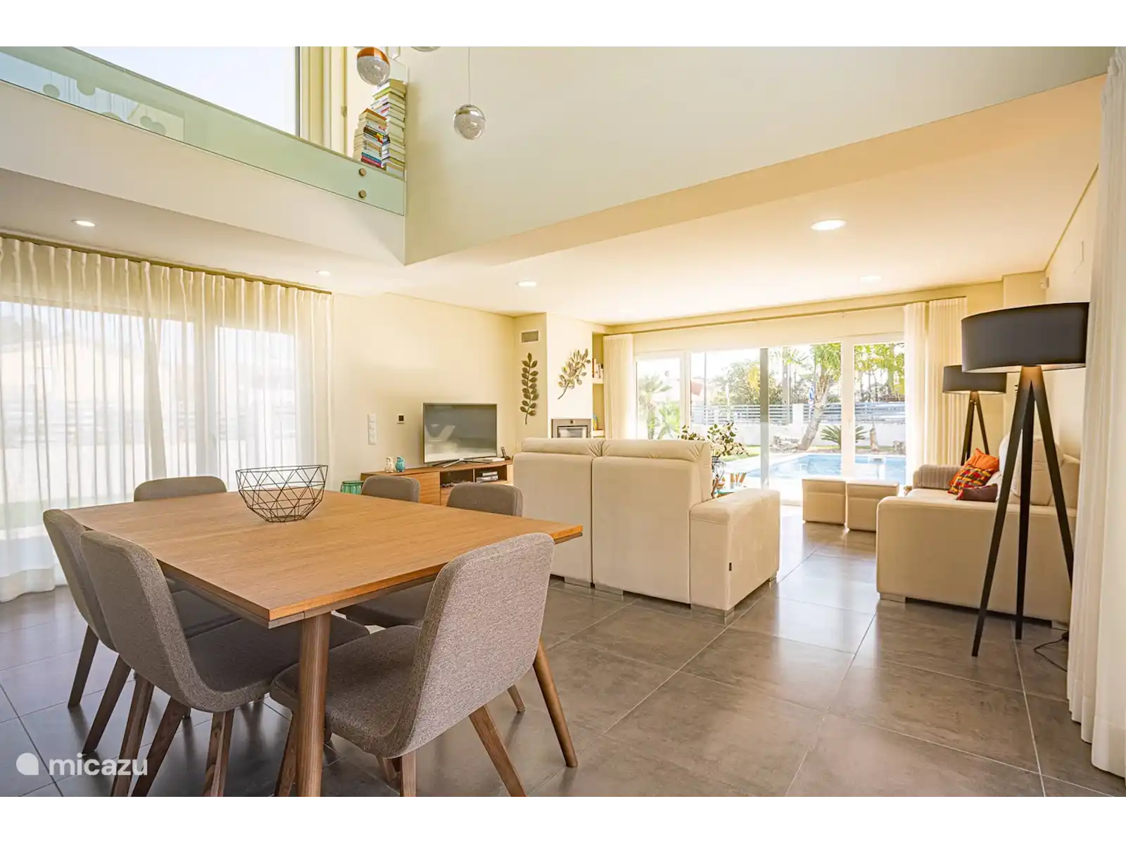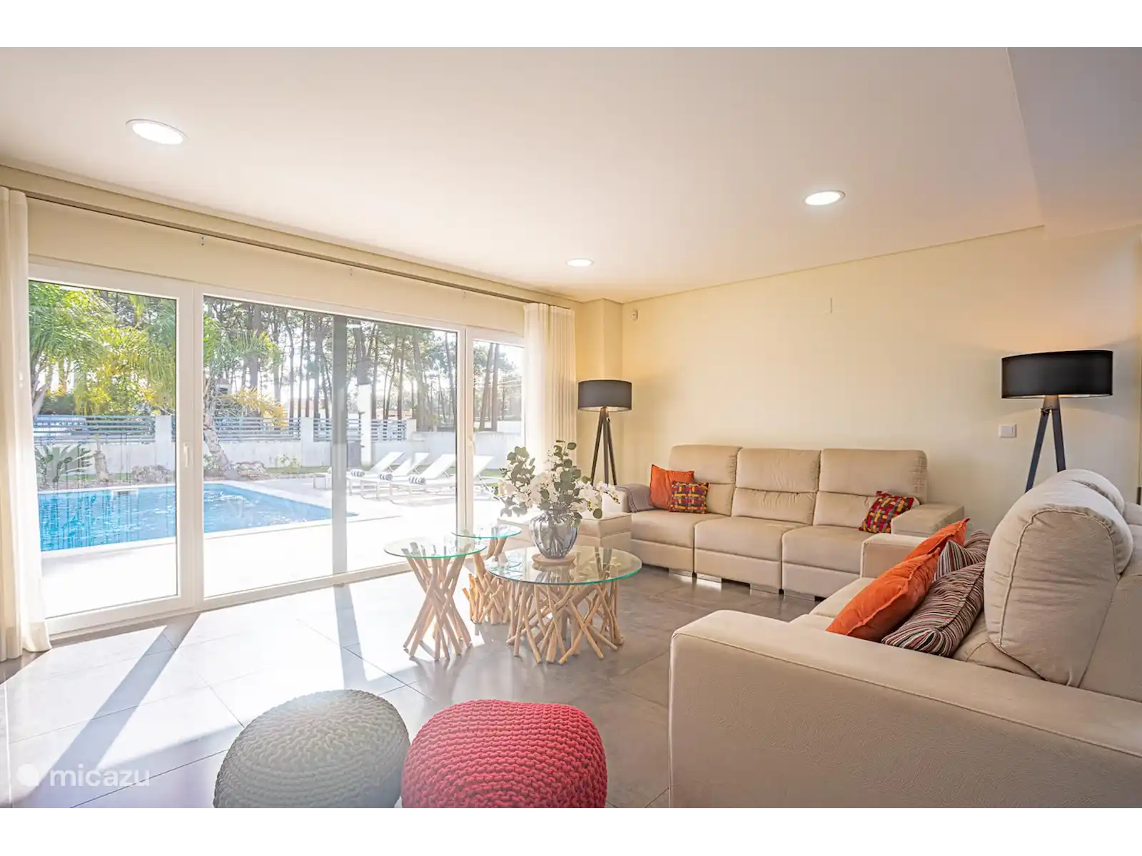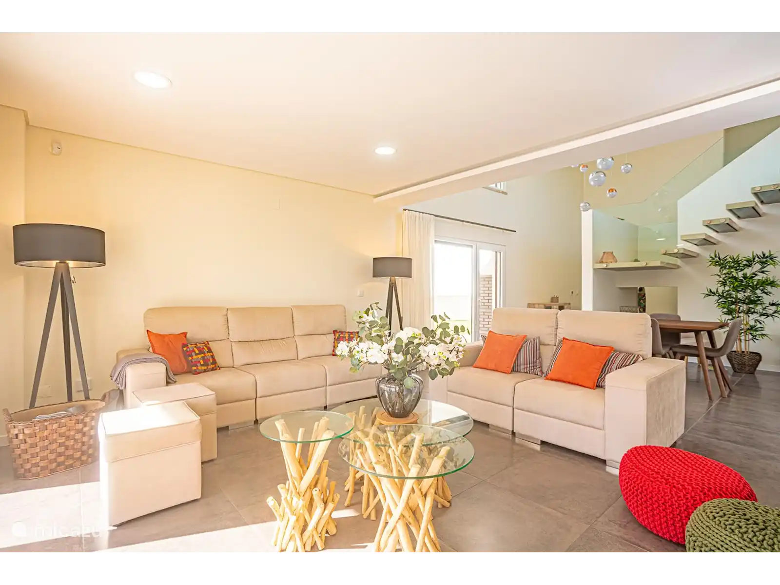 Rez-de-chaussée : Dans le salon spacieux, qui dispose de deux canapés, vous avez une vue directe sur la piscine. Derrière le coin salon se trouve un coin repas avec table et chaises. La cuisine est située dans une pièce séparée. La cuisine dispose d'un îlot de cuisson avec bar et tabourets de bar. La cuisine est également équipée d'un four, d'un lave-vaisselle, d'un four micro-ondes et d'une machine à expresso.