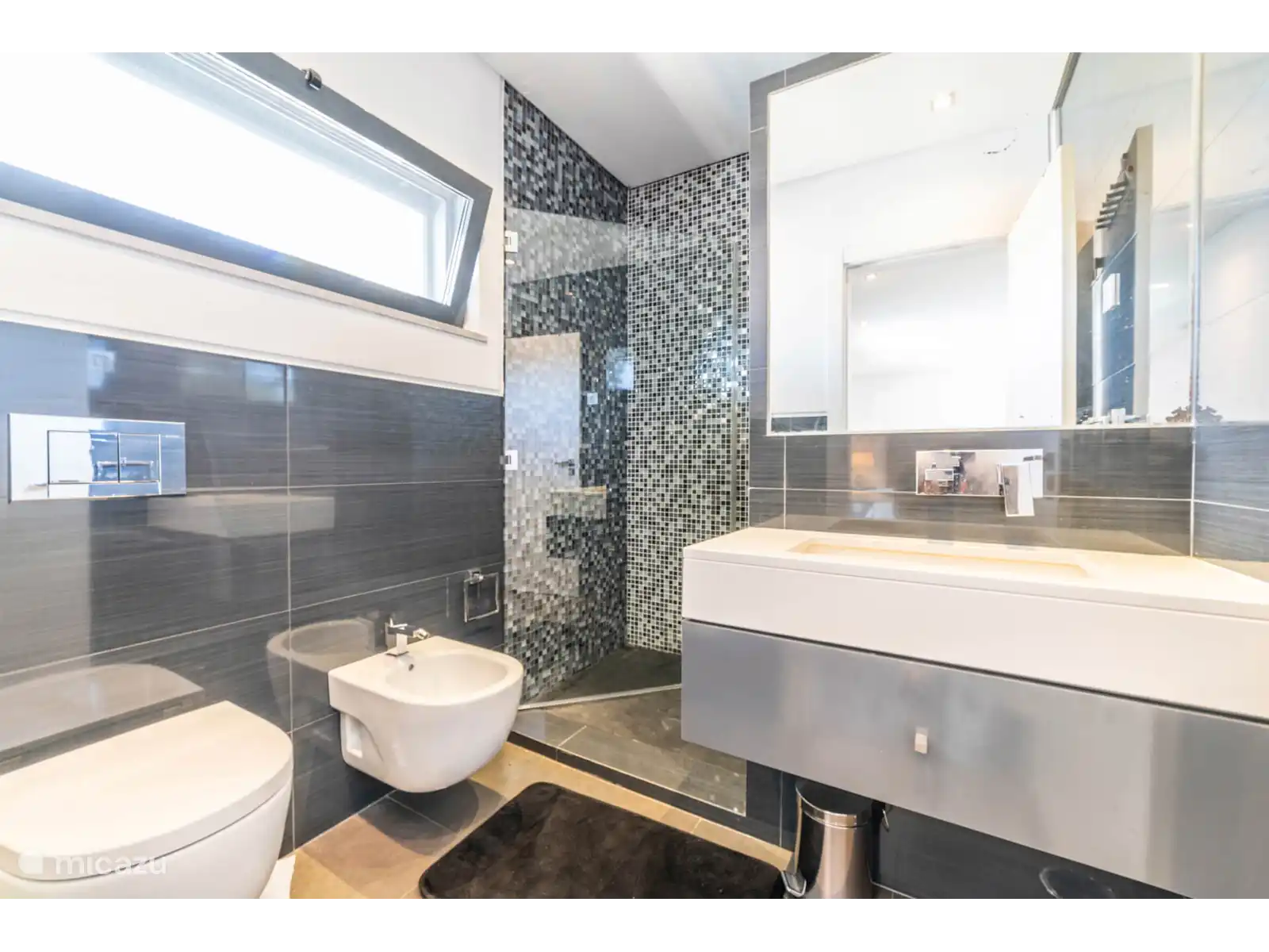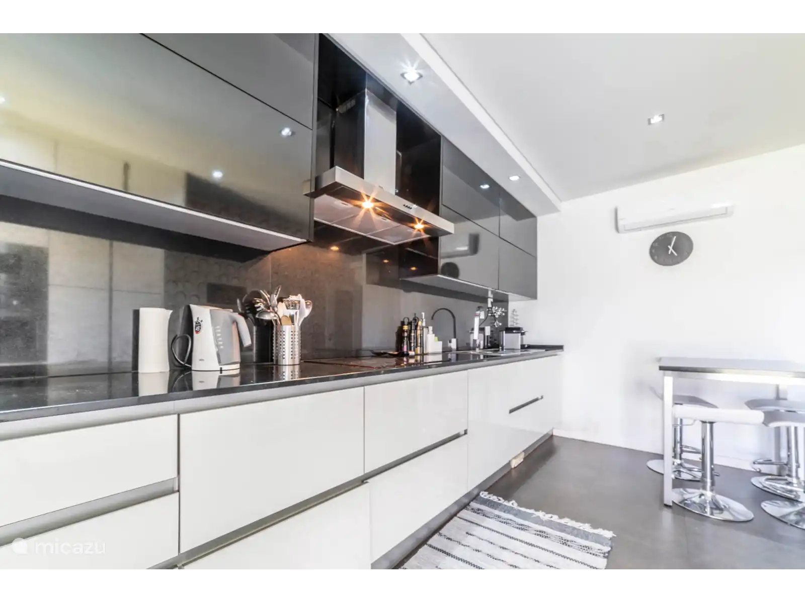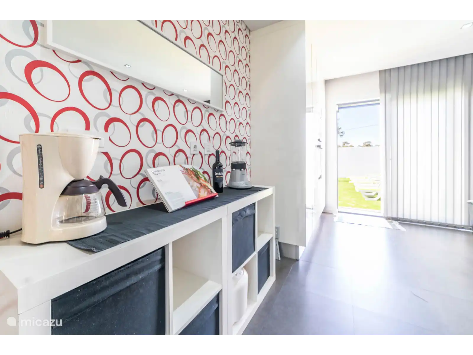 Rez-de-chaussée:Salon et salle à manger décloisonnés. Dans le salon, il y a un canapé et un fauteuil. La salle à manger se compose d’une table à manger avec des chaises. Dans la cuisine séparée, qui est entièrement équipée, il y a une table de bar avec des tabourets de bar. Dans une pièce séparée, il y a un bureau.