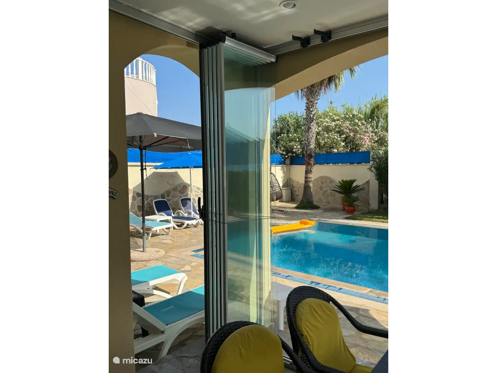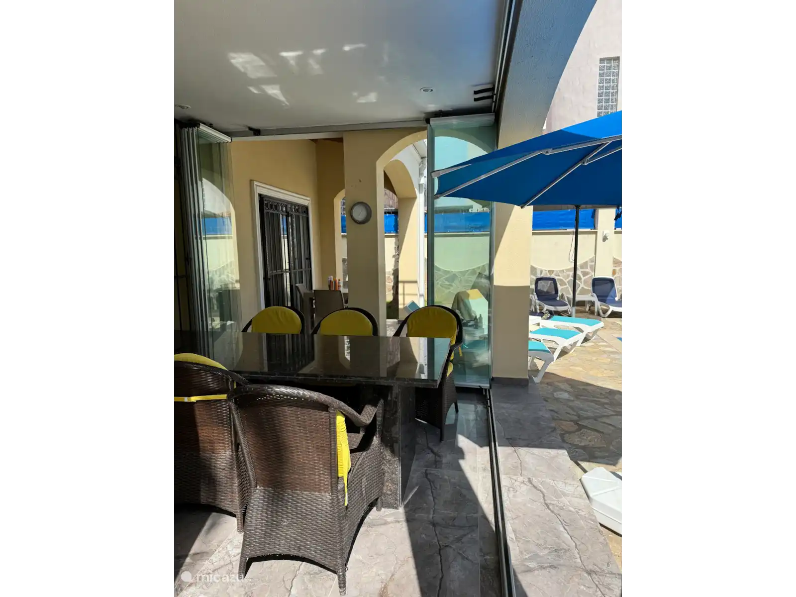 La villa dispose de 3 salles de bains luxueuses. À travers les portes-fenêtres, vous descendez sur la terrasse extérieure couverte avec une grande table à manger adjacente à la piscine. La terrasse extérieure peut également être fermée en tant que serre vitrée afin d’être à l’abri du vent. Le même porche couvert avec des sièges extérieurs se trouve à l’étage supérieur. Vous pouvez aussi utiliser une machine à laver et un sèche-linge. Nous assurons un transport 24h/24 et 7j/7 de l’aéroport à la villa (environ 20 minutes en voiture).